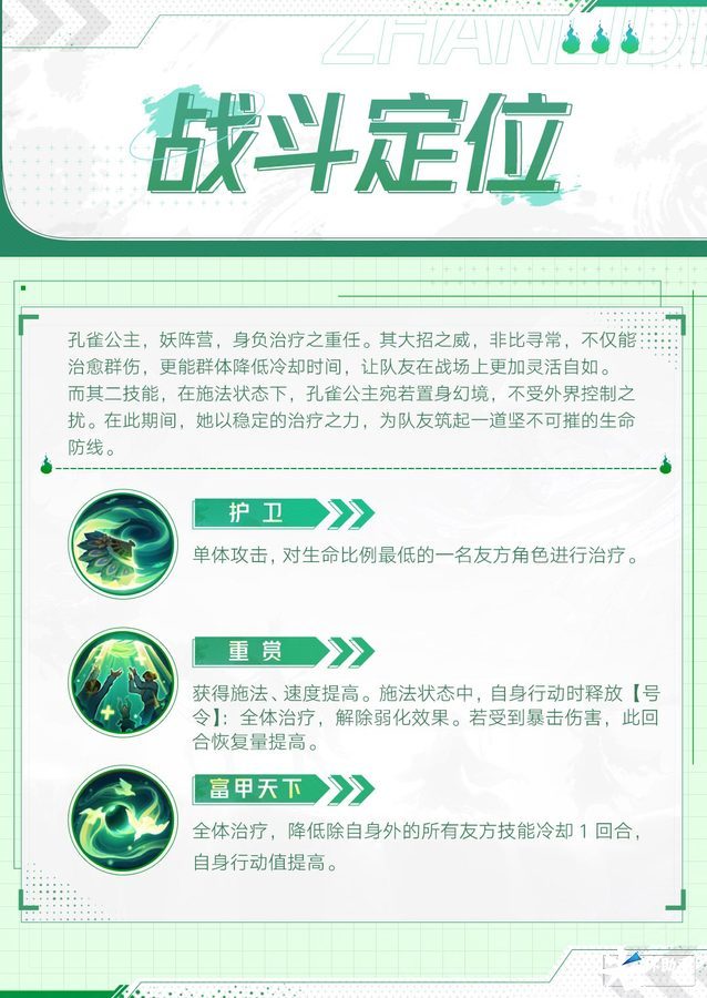 出场角色|孔雀公主勤勉搬运的后辈君发布于 2024-04-16关注>>出场角色|“说吧,想在妾身这里得到什么?”>>出场角色|孔雀公主孔雀公主,貌若柔柳,虽面似无害,却藏智慧,慧眼独具,心细如发,阅历丰富,是个说一不二的精明商人。创立孔雀商会,以倾城之貌,赢得群芳之羡;凭号禽之技,显非凡之威;更以仁善公正、言出必行之品,获众望所归。她以丰富阅历,广结人脉,遂使孔雀商会如日中天,遍布地仙界,成为商界之翘楚,璀璨夺目。>>国创战斗动画>>战斗定位