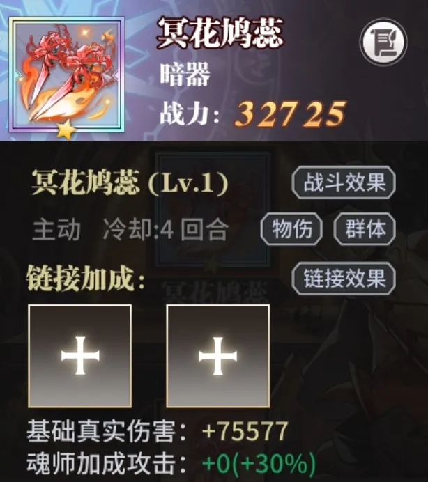第1回合开始时,对敌方2名/3名/4名/5名魂师造成真实伤害+冥花鸠蕊攻击力的共计4段物理伤害,优先攻击敌方生命值最低的单位;攻击后对敌方全体单位有80%的概率附加[恶咒];攻击后,敌方目标魂师身上每存在1层持续伤害效果,则额外附加1段冥花鸠蕊攻击力的物理伤害(最多附加4段攻击);