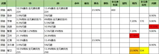 项链:暴击最高位威风项链和红骨项链,+23.9%暴击,威风还加400的全元素伤害,所以作为第一选考虑。