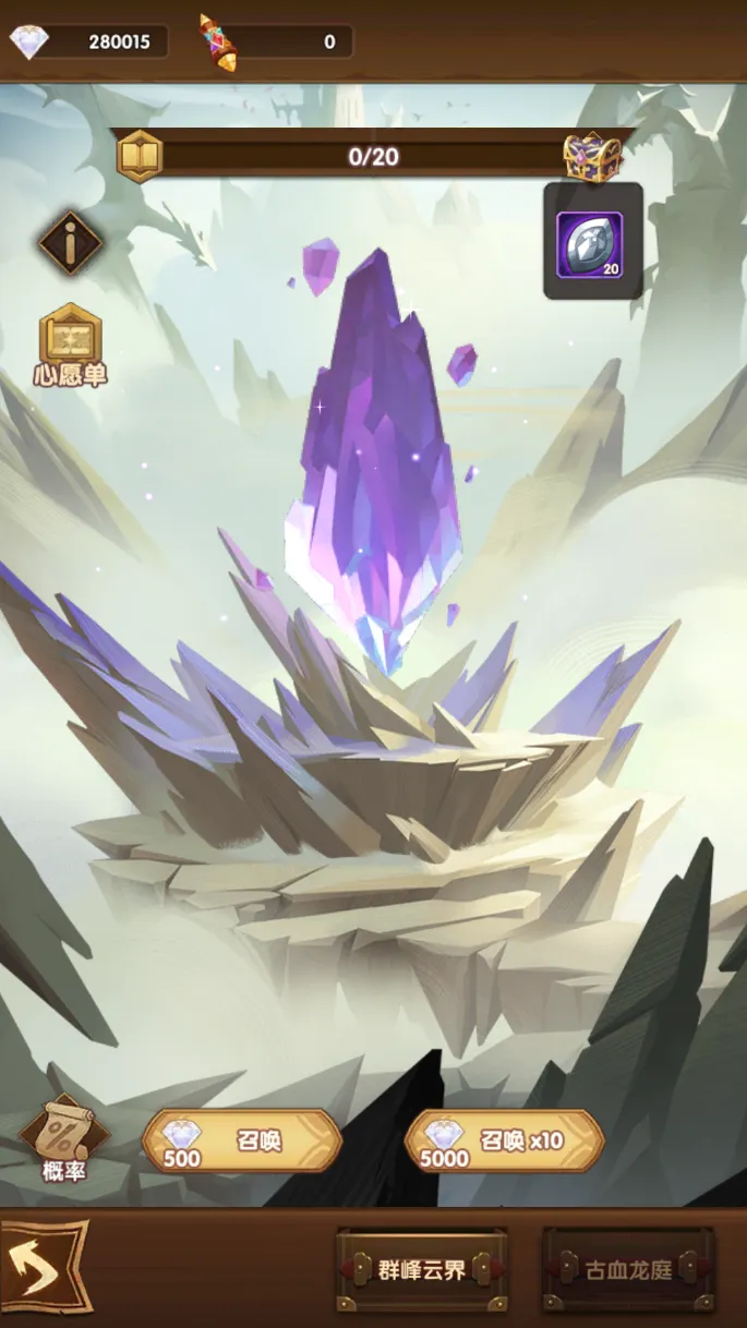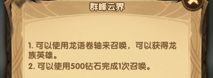 1.巨龙古塔:用于召唤龙族英雄。其中“群峰云界”功能将在通关关卡4-20后解锁,冒险者可使用“龙语卷轴"召唤所有龙族英雄;“古血龙庭”功能将在通关关卡16-1或VIP6级后解锁,冒险者可使用“龙血纹章"定向召唤心仪的龙族英雄。