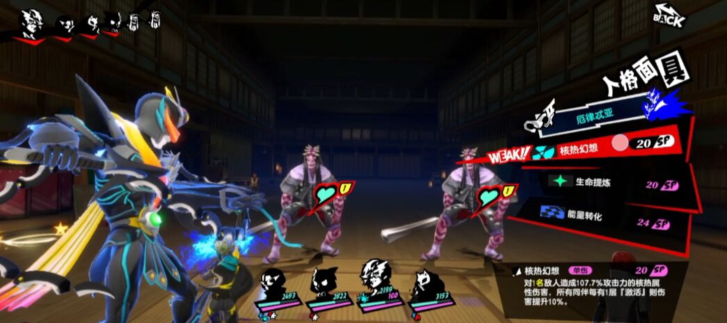 神山岭央直接1技核热攻击起手,选择1个水鬼攻击就行,触发weak机制。因为这个水鬼需要触发2次weak机制才能倒地。