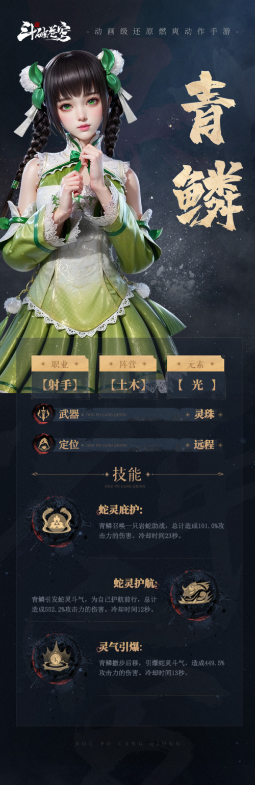 在游戏中,我们还原了青鳞小家碧玉,清秀可人的形象。技能设定上,采用了符合人设的灵珠作为武器,采用了远程战法,展示出了青鳞可爱的轻盈灵巧的感觉,喜欢这类角色的斗者不要错过了哦~