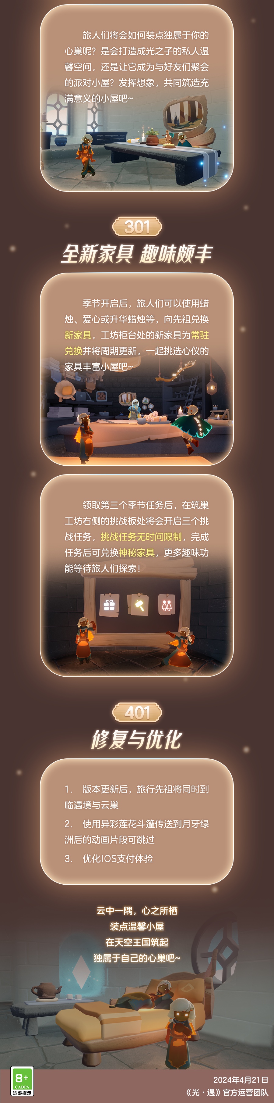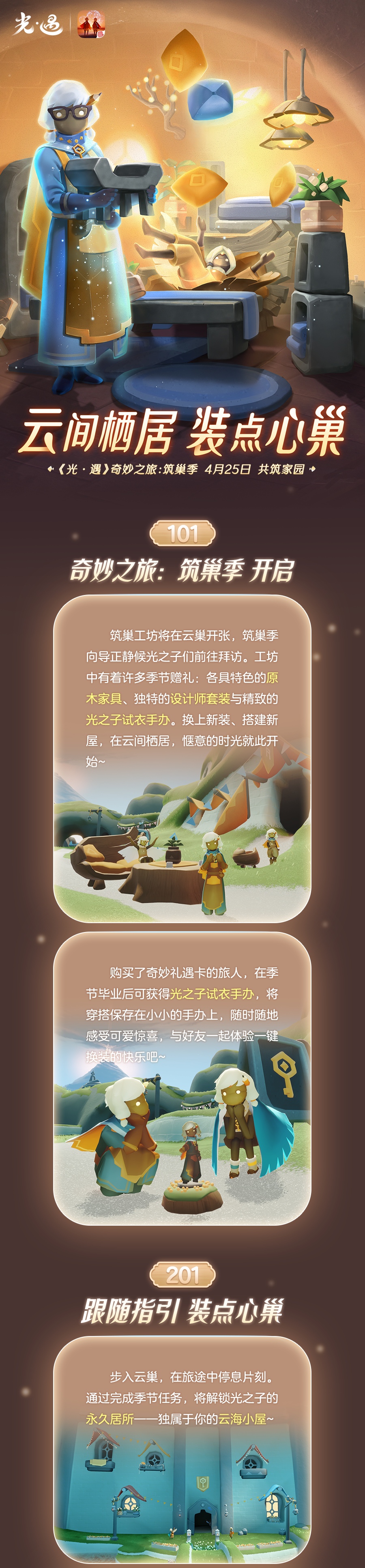 《光·遇》4月25日 奇妙之旅:筑巢季更新内容公告是泽哦发布于 2024-04-21关注在工坊中随心挑选家具推开门扉装点温馨居所🏠《光·遇》奇妙之旅:筑巢季将于4月25日正式开启请旅人们仔细阅读更新公告,了解更多活动信息🗝️《光·遇》奇妙之旅: 筑巢季 4月25日 共筑云端小屋吧~