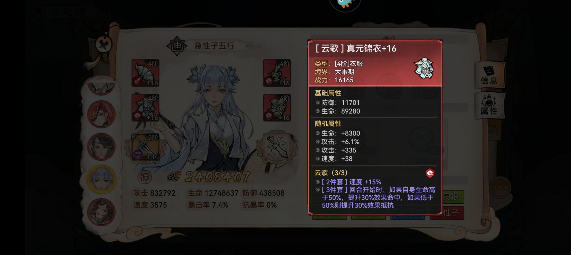 因为3件套的云歌是有提供效果命中以及效果抵抗的!
