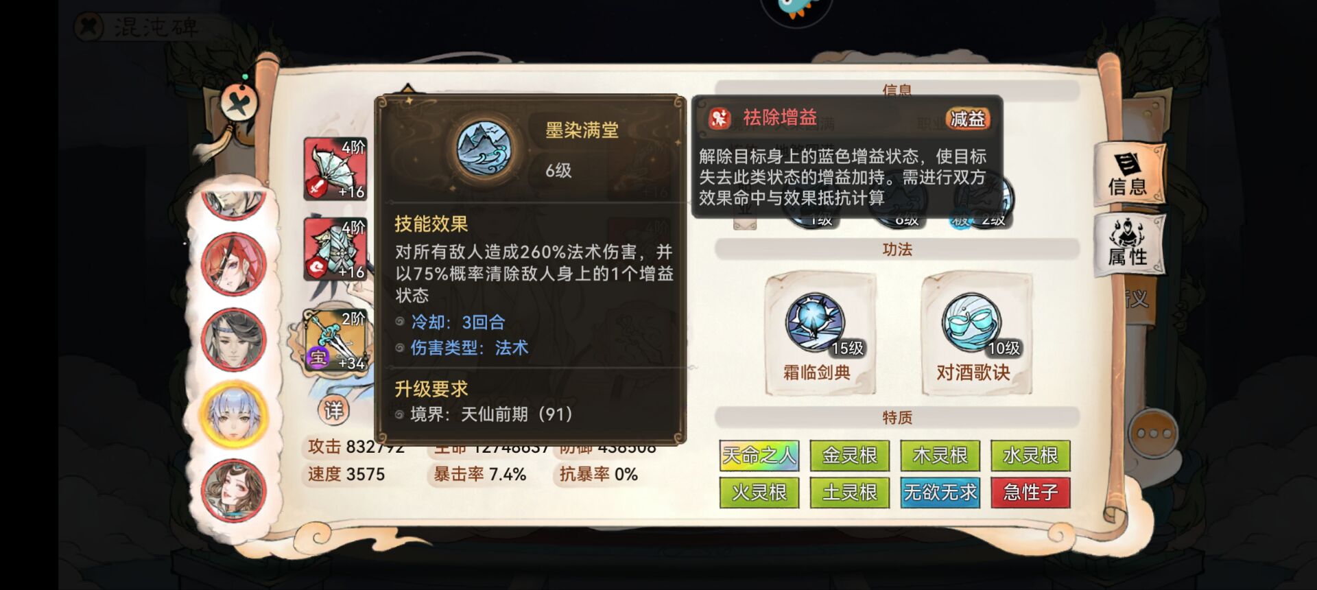 ①主动技能能够祛除全体敌人的身上的1个增益效果,而且几率是75%。