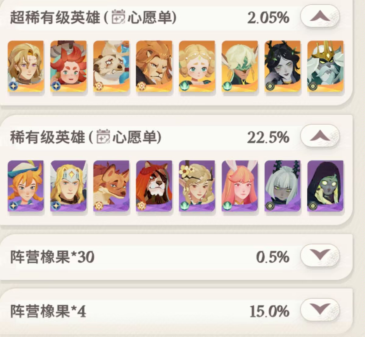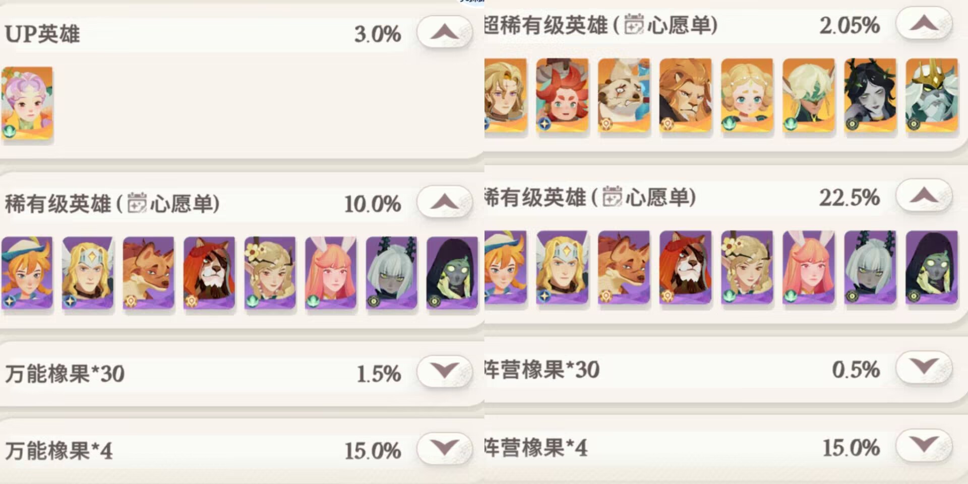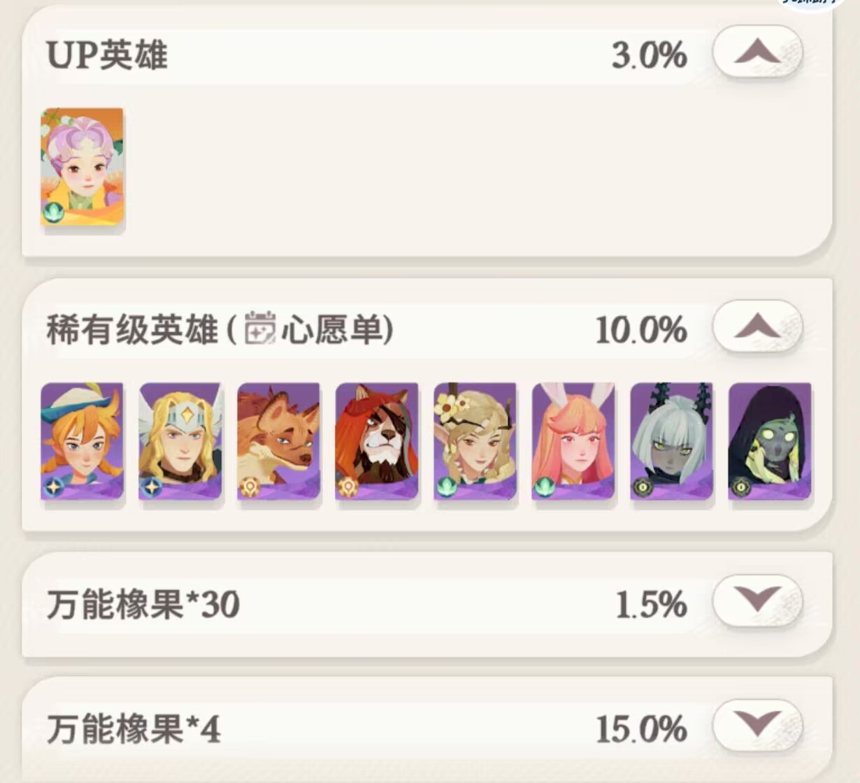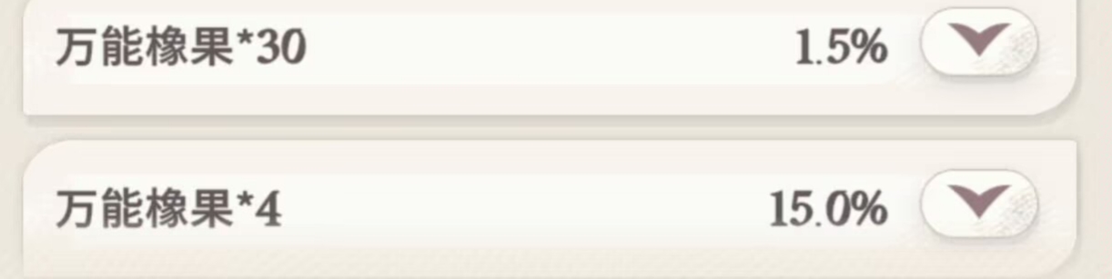 然后这里有玩家会说:狮子,虽然up池出紫色的几率低,但是像果出的几率更高啊!橡果我们基本是不缺的!无论是前期中期还是后期,橡果一点不用担心,这点不能成为理由。