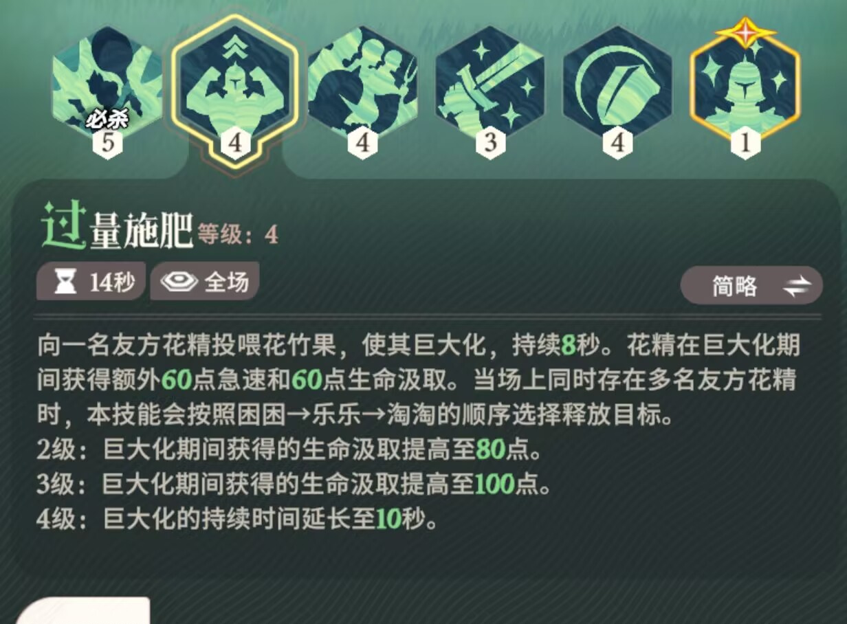 ②二技能为:【过量施肥】。主要效果是让一名召唤的花精巨大化8秒,技能满级后最高可以提升到10秒。