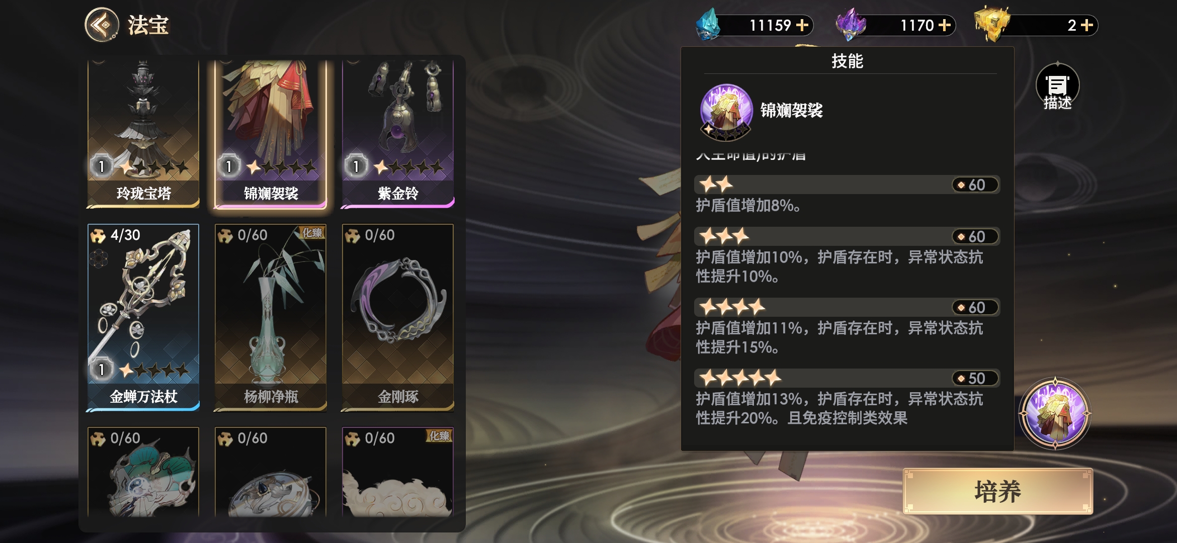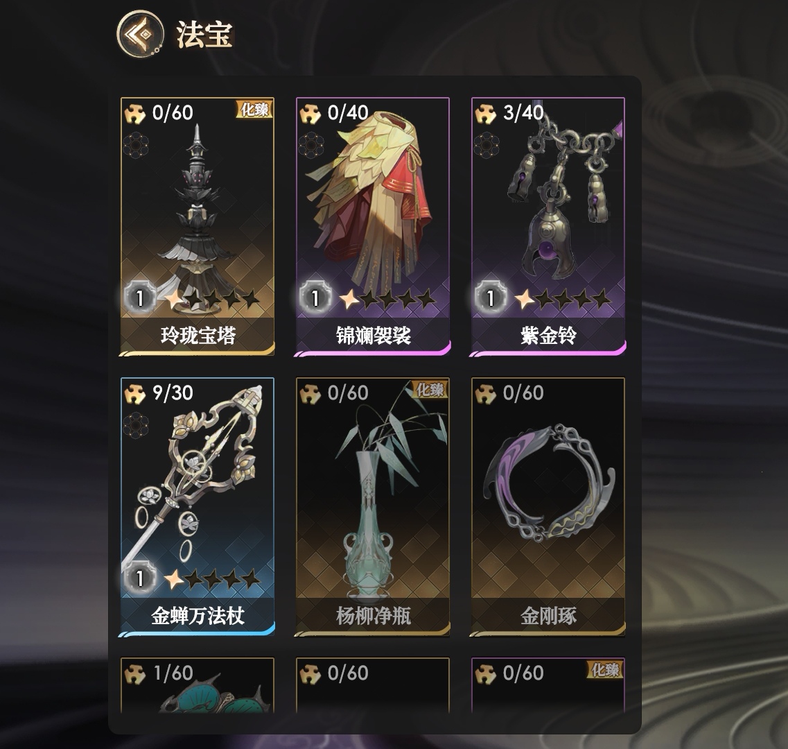 低星时就已经是非常强力的法宝了,5星时更是成为第二个人权级法宝。锦斓袈裟所有阵容