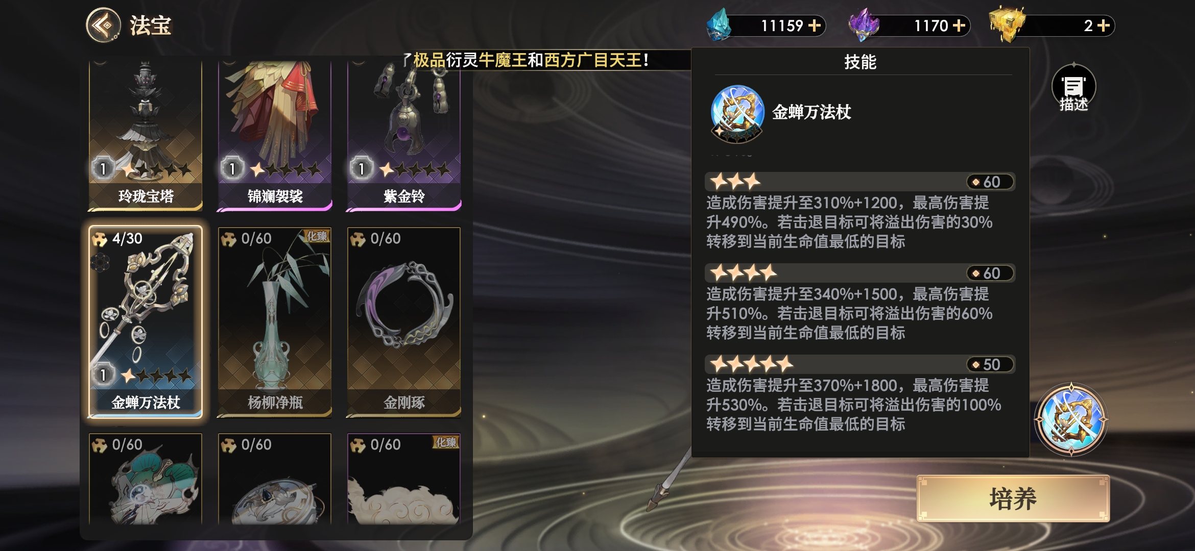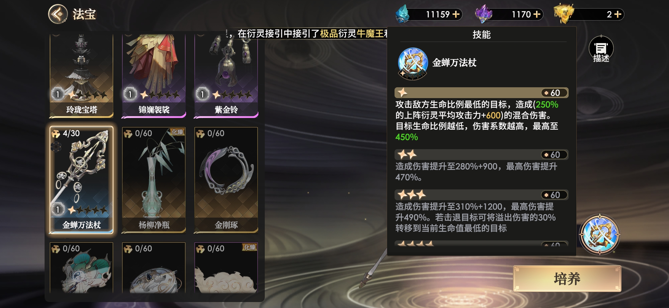 万法杖作为功能极其单一的输出型法宝,能锁定敌方血量最少目标造成极高倍率的单体输出,目标血量比例越低,伤害越高。高星级时若击退目标还能将溢出的伤害继续对当前血量最低的目标造成伤害,即如果对方有2个血量很少的目标时,有几率同时击退2人!