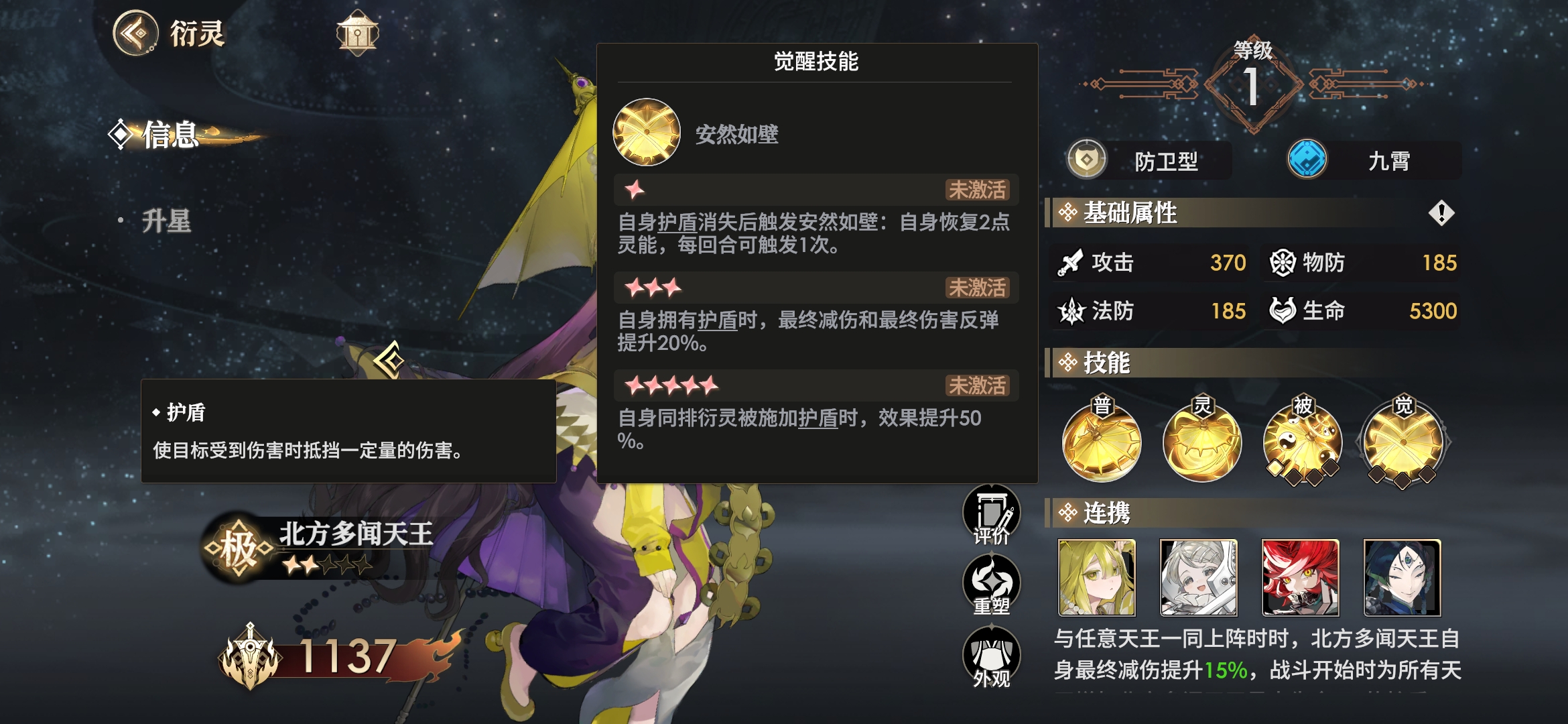 作为全游戏唯一能给我方全体套盾的法宝,能极大幅提高我方的整体坦度,尤其是在我方有多闻天王时,他的天赋不仅能让自身带盾时增加减伤和反伤,还能为同排队友提供额外护盾量。而高星时还能额外为我方全体提供极其珍贵的异常抗性和免控。