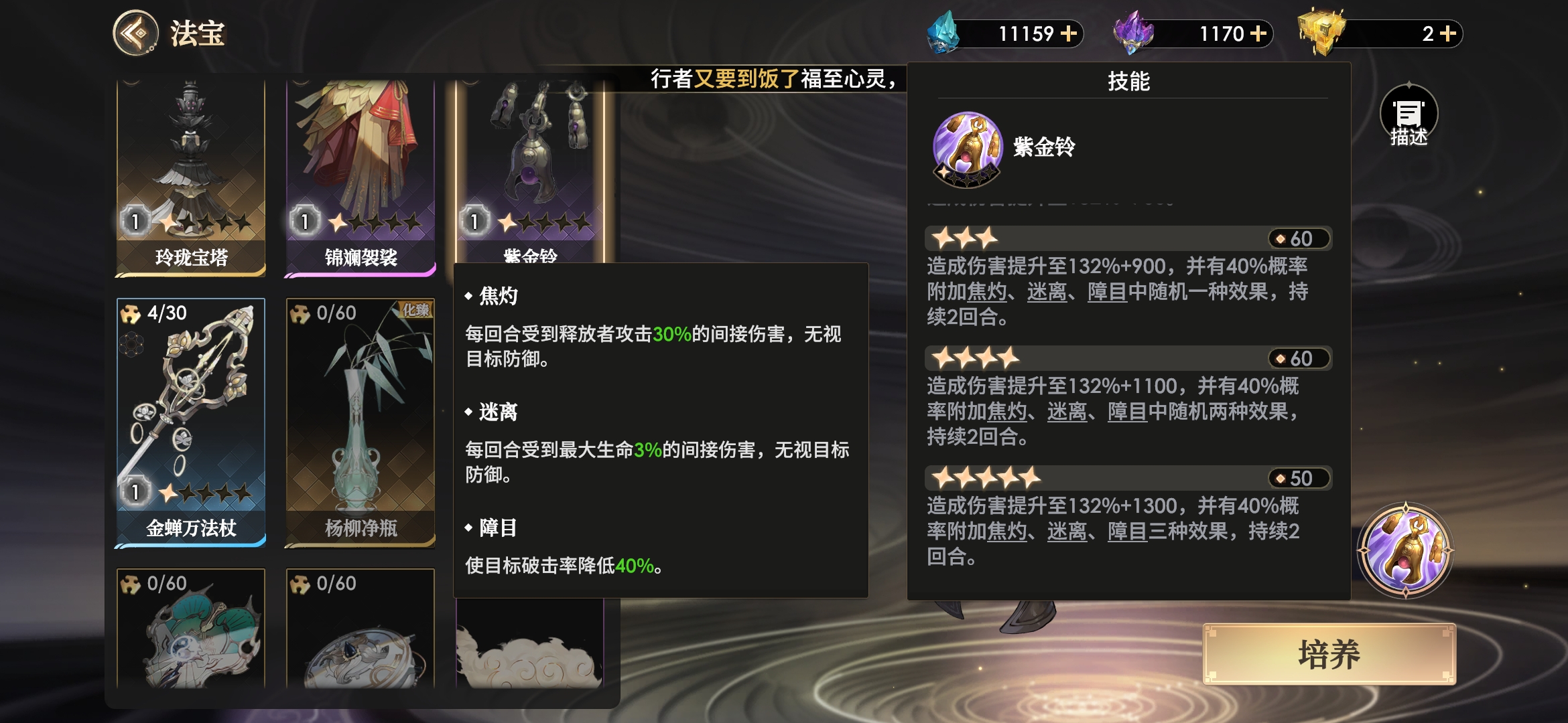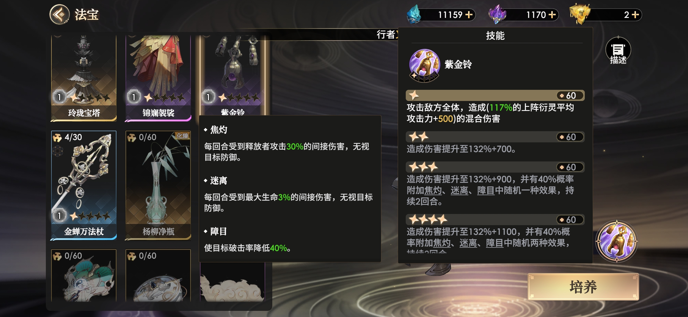 紫金铃是我方能获得的第一个全体攻击法宝,在新手期能提供大量的输出,虽然输出较为分散,但总体输出算是比较可观了,而高星时有40%几率为敌方挂1-3个减益状态。