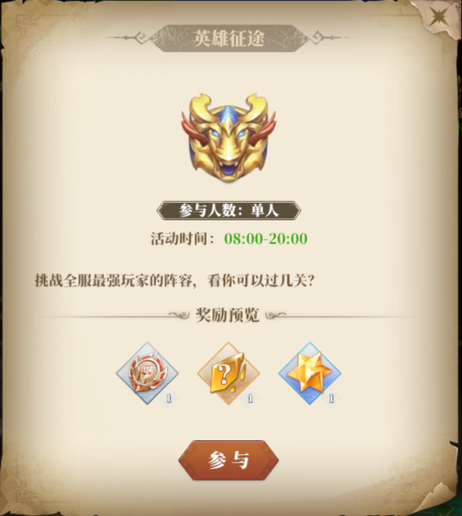 【玩法攻略】限时活动-英雄征途勤勉搬运的后辈君发布于 2024-04-25关注每周一周四都会开启限时活动英雄征途,活动时间在08:00-20:00,挑战全服最强玩家的阵容,看你可以过几关。1.挑战征途关卡每一层看守者,通关后获得指定奖励。2.每个关卡只能通关一次,次日可以通过重置功能重置关卡进度。3.重置关卡也会刷新通关奖励。4.在本玩法中战斗胜利后阵亡的伙伴无法再次上阵。5. 通关指定层数可以获得通关奖励。6根据通关层数与通关时间进行排名,发放排名奖励。