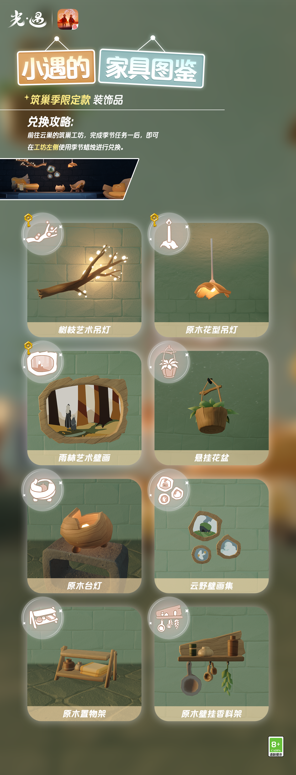 小遇的家具攻略1丨为小屋增添一份色彩和温馨是泽哦发布于 2024-04-26关注“诶?那里怎么亮亮的?”“是筑巢季好看又实用的装饰品啦~”“未来可以用它们装点温暖的小屋了!”🖼️正在筹备新居布置的小遇把众多家具分类做了功课感兴趣的光之子们一起来看看吧~