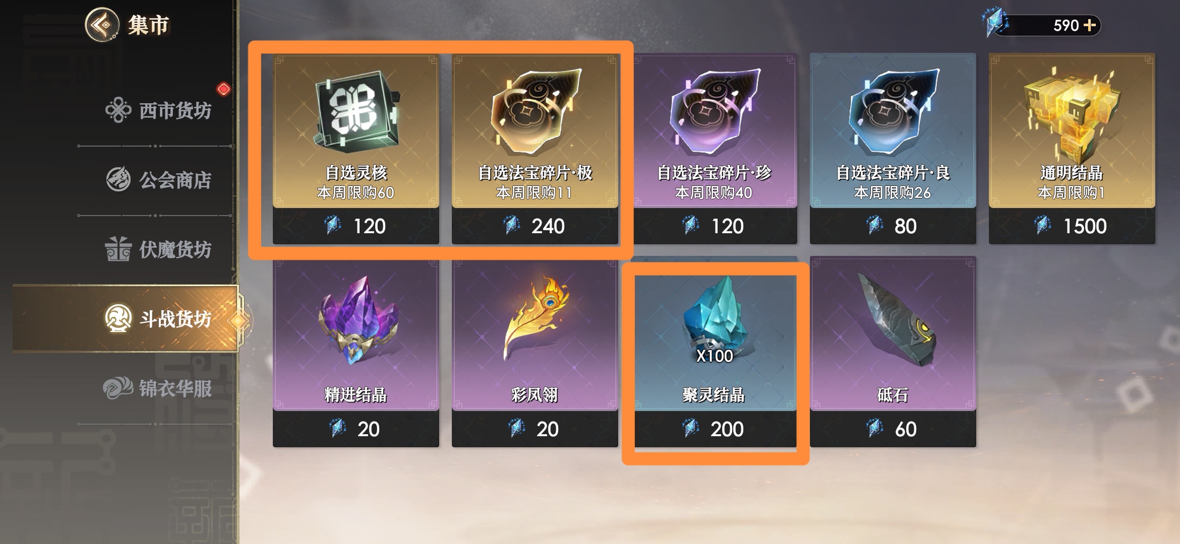 其次就是自选法宝碎片和自选灵响碎片,缺哪个换哪个就行,一般来说都是法宝碎片更缺一些。而通明结晶就不需要在这里购买了,因为拍卖行产出量极大,基本底价就能买到。