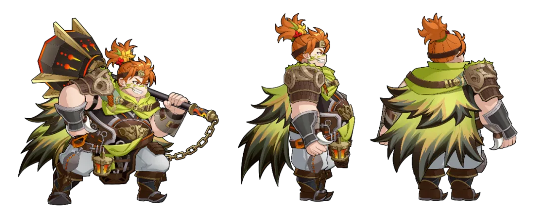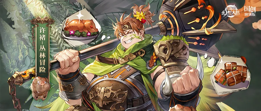 皮肤以丛林冒险为主要灵感,整体风格活力有趣。丛林深处,许褚一身探险装扮,身披迷彩斗篷,腰际水囊与提灯并挂,提灯则如萤火般闪烁微光,照亮前方险途。许褚手中紧握刚猎获的小野猪,正琢磨如何将这丛林的馈赠烹制成美味佳肴。