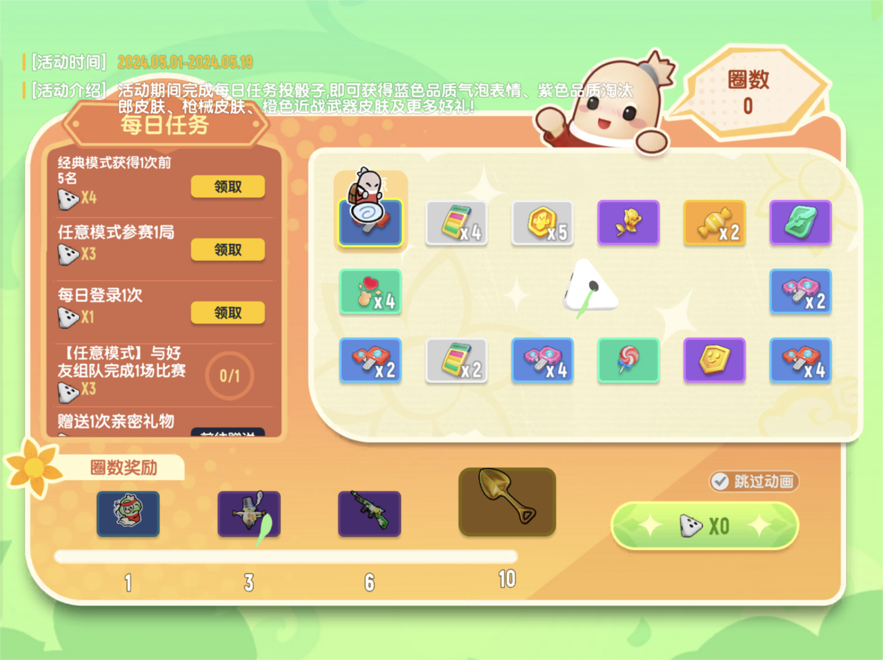 在活动期间,完成每日任务即可获得相应的投骰子机会,投出骰子将获得相应步数,前进步数后,即可获得对应格子中的奖励!