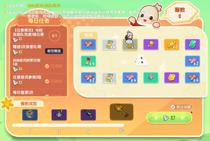 格子中的奖励包括点券、缤纷补给箱钥匙友友卡、彩虹补给箱钥匙、免哭金牌、亲密礼物糖果、季票勋章等~每当肠肠绕完指定圈数后,还可以获得对应的特别奖励!