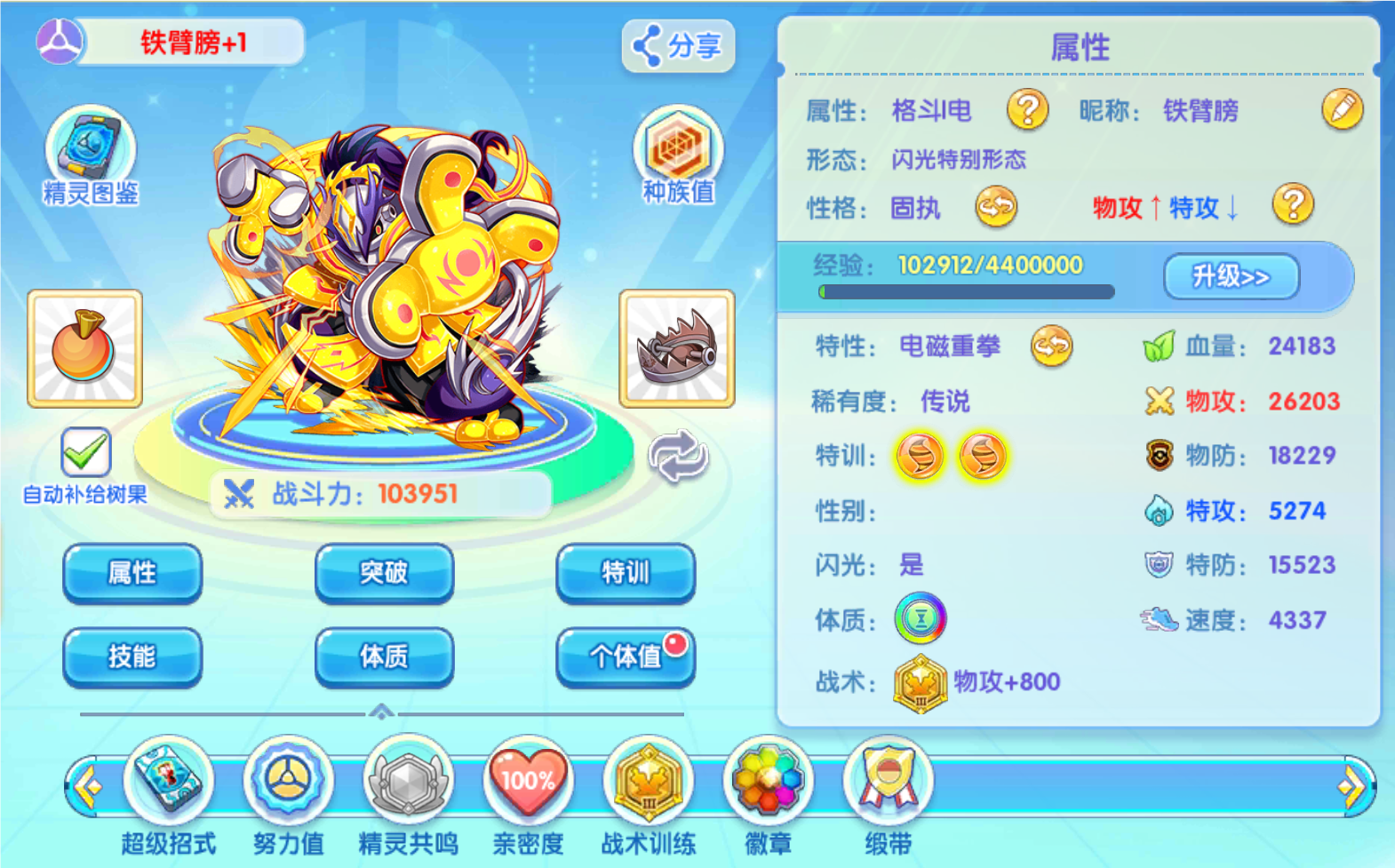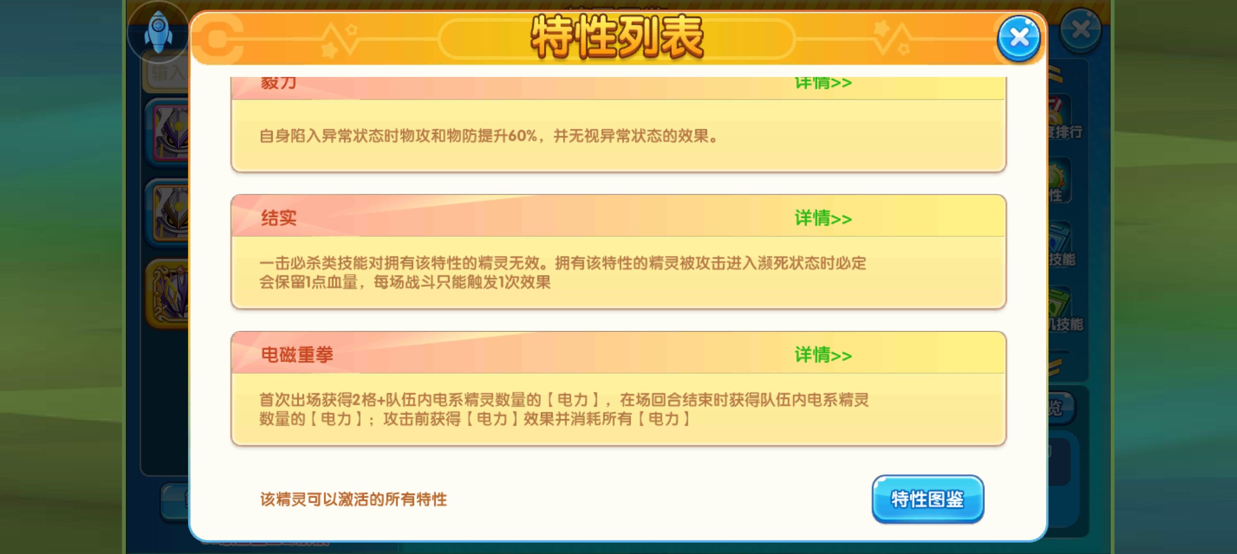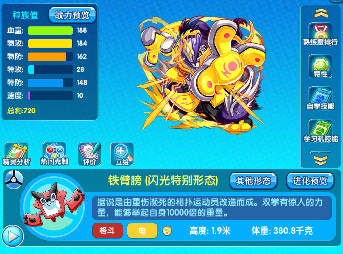 从属性上面来说,自身的属性是电属性加格斗属性,这个属性谈不上抗性有多好,但是打击面算是比较丰富的,当前版本下可以针对恶食大王,还有小马当然了小马的也可以搭配该精灵,主要还是由于自身的特性机制。