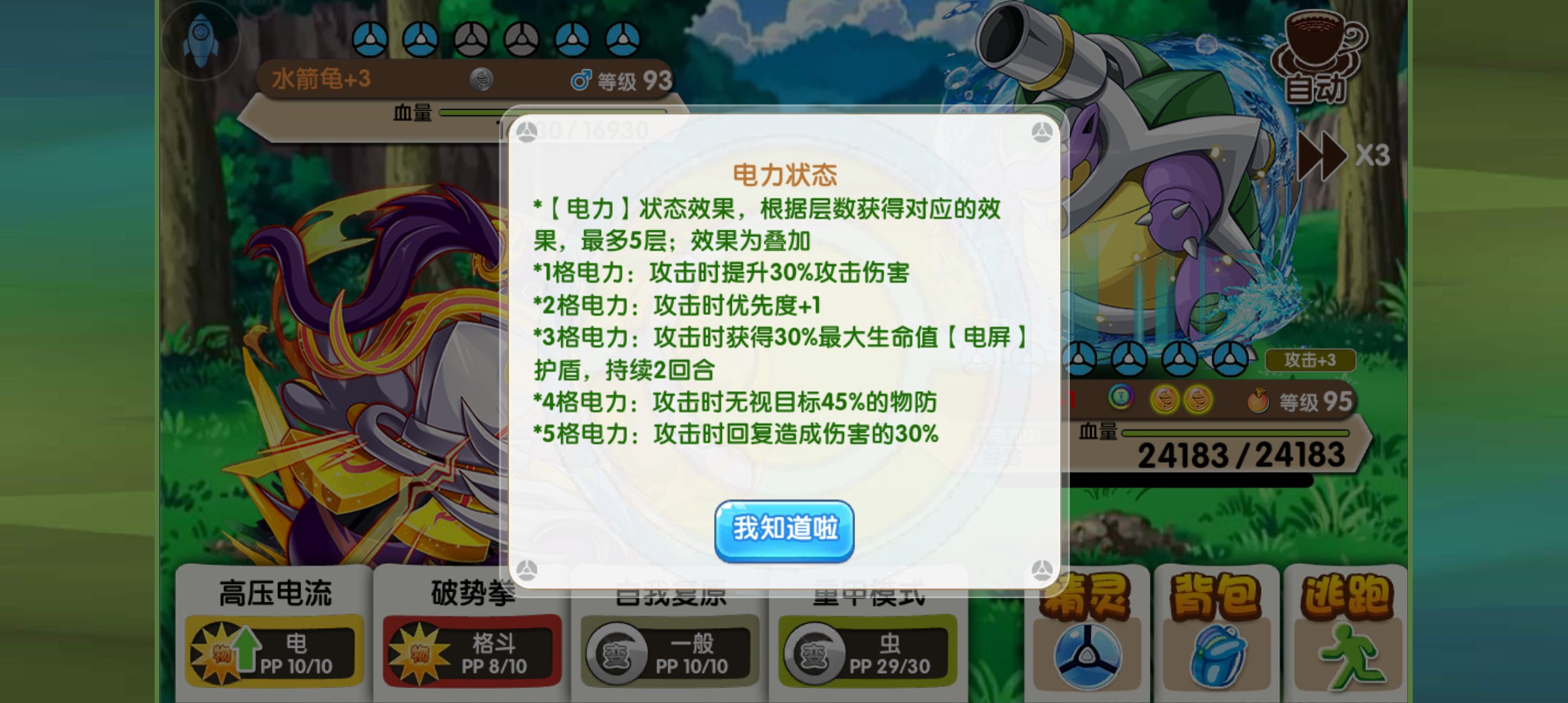 这里要讲一下,为什么要带电喙?假设背包里面拥有两只电系宠物,那么每个回合结束,自身拥有两格电力状态,就可以保证自己的攻击技能先手从而保证该技能的效果正常触发能让伤害翻倍,别看自身的速度低到爆炸,但是拥有技能优先度,保证伤害翻倍,还能够打出相当高额的伤害。