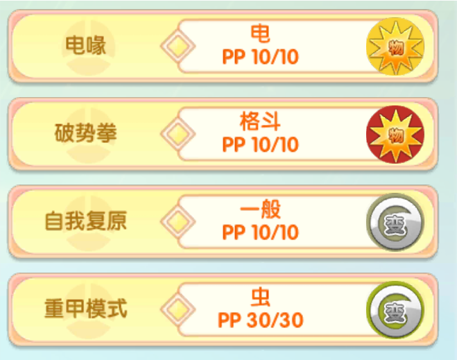 该精灵并没有什么专属技能,所以在技能选择方面就比较的广泛了格斗属性技能可以考虑潜能蹴击能够让对方无法回血,专门克制些膀胱宠物也是可以的不过我这边给出的配置是破势拳,这个技能打先手收割的话,可以自身增加速度和攻击力,虽然说这个精灵不太依赖速度,但是对于攻击力来说很依赖,毕竟特性带来的伤害只不过是增加了30%,如果保证在理想的情况下,自身一拳一个把对面收割,那么就可以保证自己的伤害会越来越高。