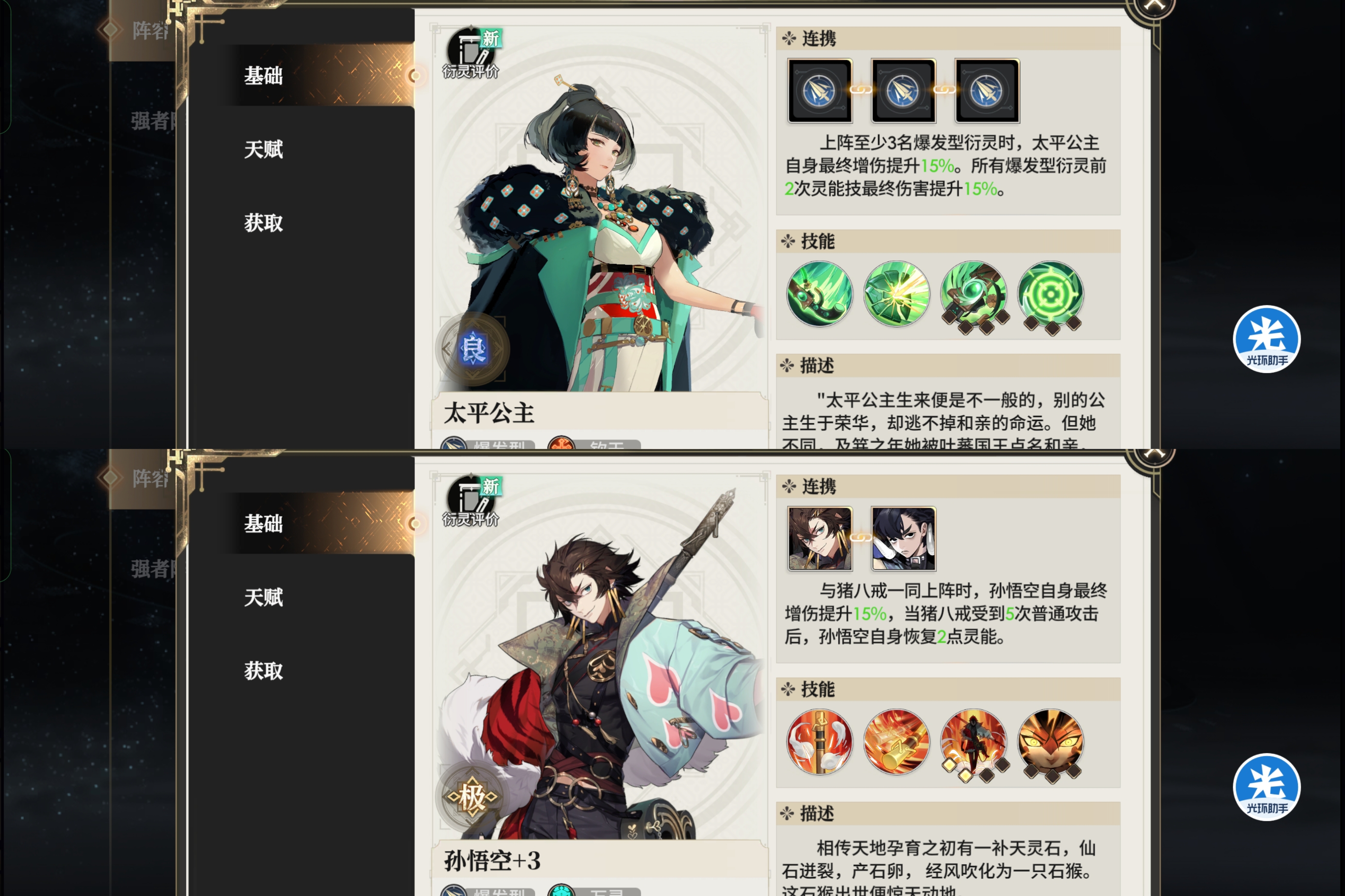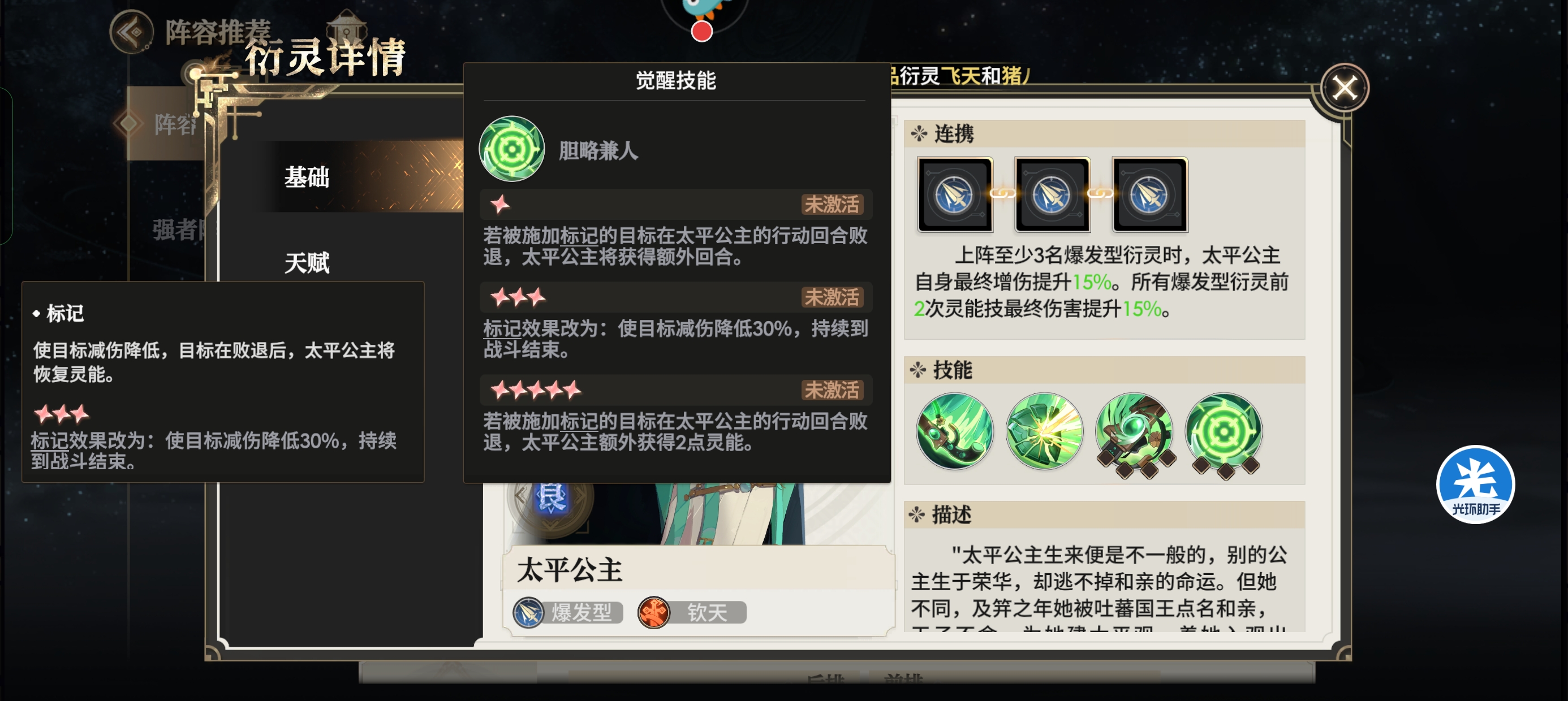 但是这里有个问题太平公主需要觉醒1星才能玩,觉醒5星是质变。因为觉醒1星以后太平公主击杀敌人以后,才能获得【额外的行动机会】。相当于击杀敌人后,才真正能够做到无限收割的机制。