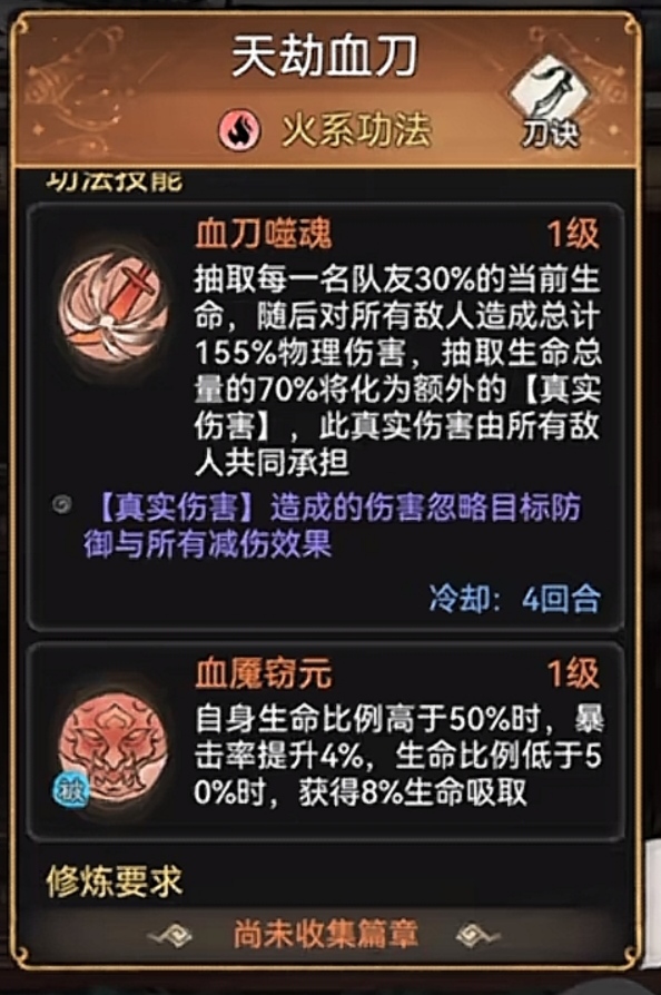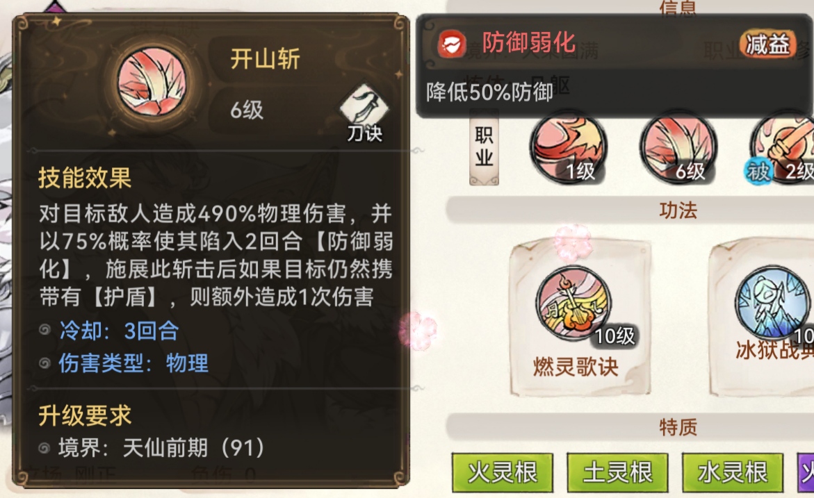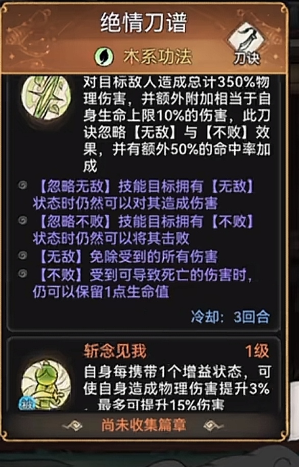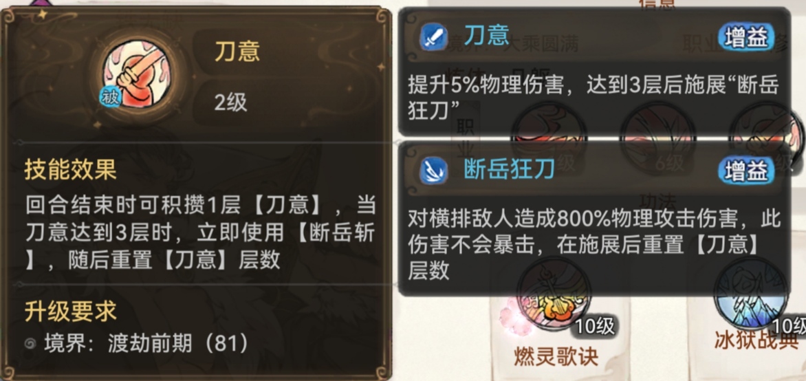 我们再来看刀修的技能,首先是普通攻击,对一名敌人造成160%物理攻击伤害,跟剑修的一样。二技能的效果为造成490%物理伤害的同时且有75%的概率降低对手50%的防御,持续两回合,如果在施展完斩击后对方还有护盾,则额外造成一次伤害。而剑修的二技能则是造成225%的物理伤害,此技能有额外的30%的暴击加成。这个二技能是刀修比剑修是要强上不少的。刀修的被动最重要的就是积累三层刀意就可以释放断岳狂刀,对敌方造成高额伤害。而剑修的被动就是提升剑诀技能威力12%。从这个被动来看,刀修也是比剑修要好的。