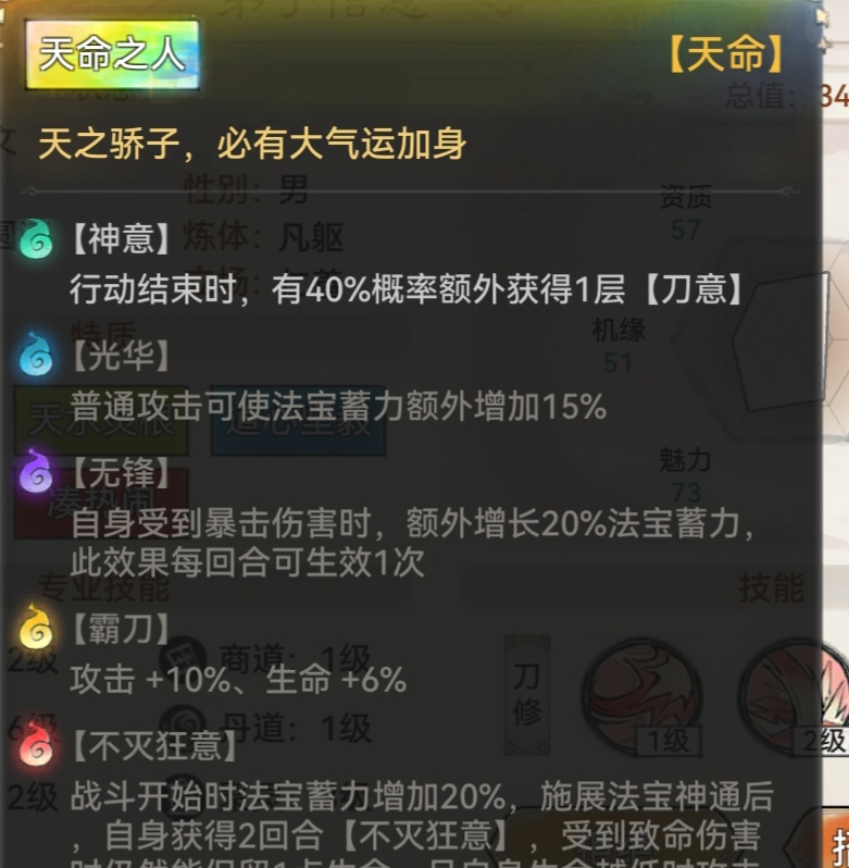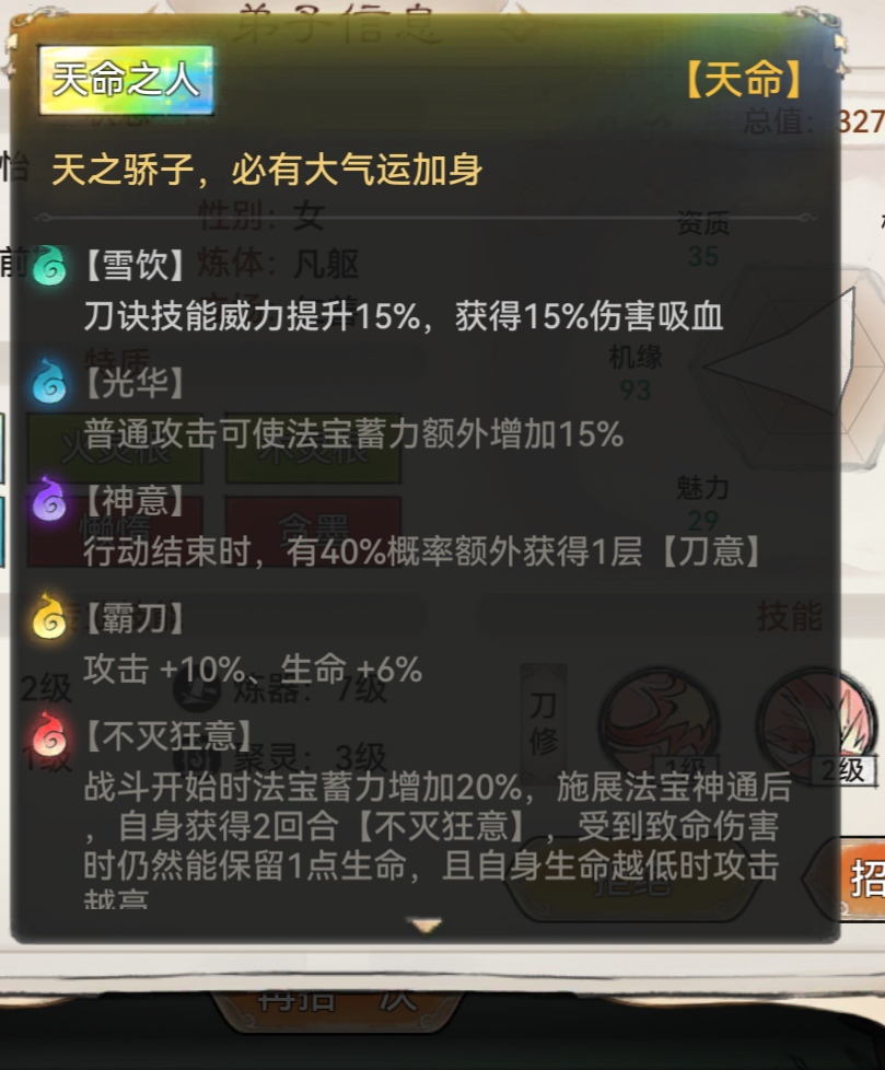 我们再来看刀修的天命,其中天命雪饮,是提升刀诀威力15%,和获得15%的伤害吸血,另一个天命神意,是回合结束有40%的概率额外获得刀意,这个天命是大家在招募刀修时需要重点考虑的,另一个就是快刃,使用完开山斩之后可额外获得一层刀意。还有天命磨刀,当回合数为单数时,提升4%的攻击,当有多个提升攻击的效果时,以最强效果为准。这一点在其他地方也受用,就是当弟子有多个相同增益效果时,以最高的效果为准,所以大家在选择功法和装备时,尽量避免出现多个相同的增益效果。然后就是可以提升法宝蓄力的一些天命,无锋和光华。这是我给刀修天命排的重要程度,另一个就是剑修天命的重要程度,大家可以自行比较,图片我放评论区了。