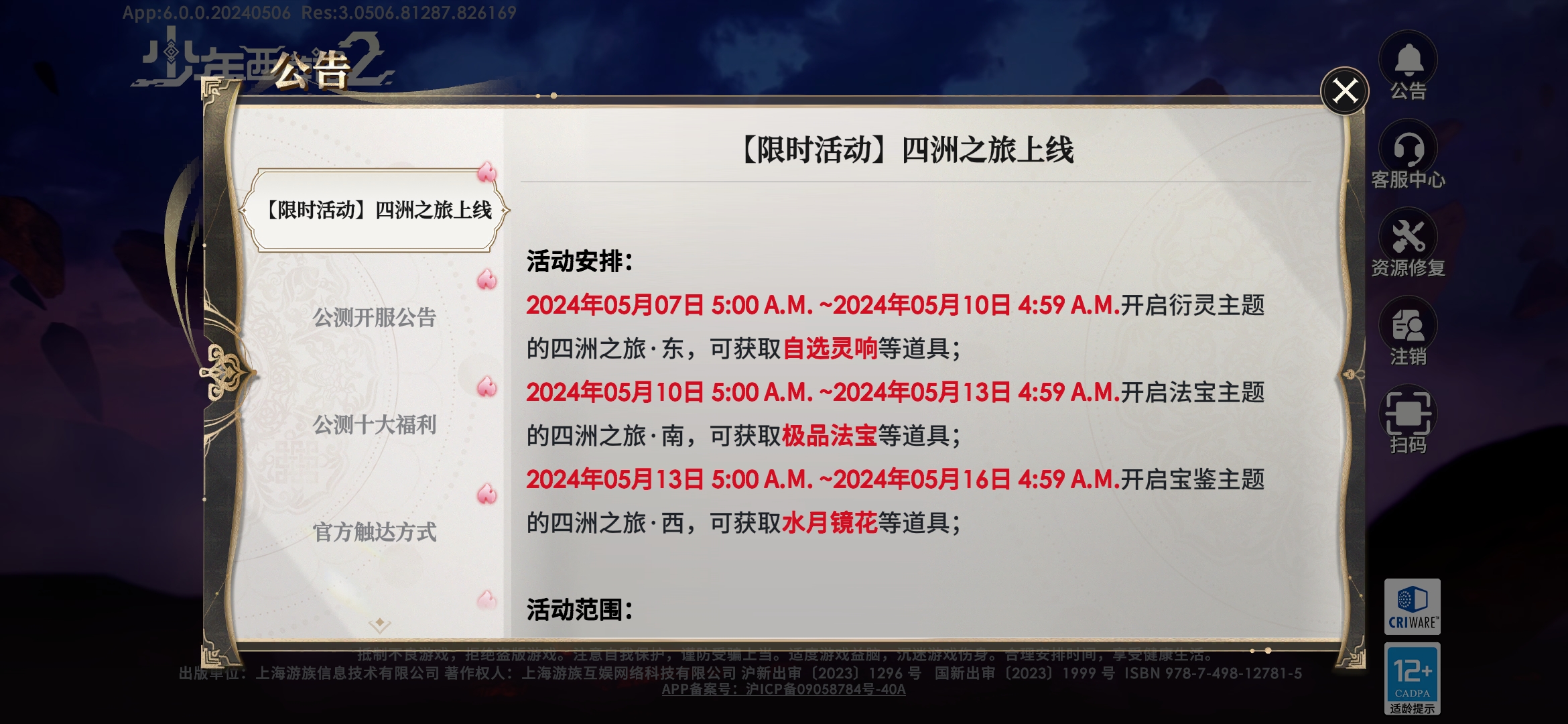 目前四洲活动只出了三个,没有北洲,三个活动中南洲活动是最值得参与的,因为可以获得稀有的化臻橙法宝,而东和西获得的奖励从其他活动或拍卖中也可以获取。