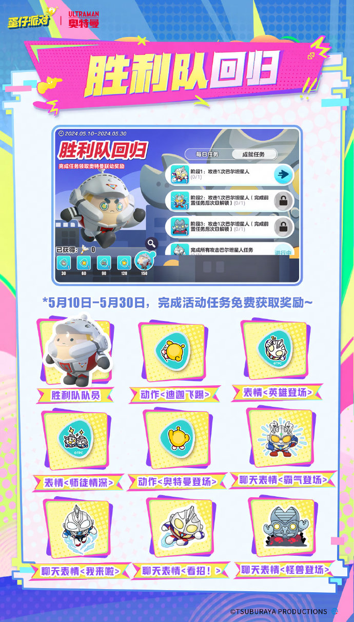 《蛋仔派对》&奥特曼联动返场5月10日重磅开启!光环-小Y发布于 2024-05-07关注英雄集结,奇迹再临!5月10日(周五),《蛋仔派对》&奥特曼联动返场重磅开启!迪迦、赛罗、泽塔、巴尔坦星人、胜利队队员五款外观即将重返蛋仔岛。劲敌来袭,没有趁手的武器和招式怎么行?高举“神光棒”,集结三位光之伙伴,施展“哉佩利敖光线”必杀技击溃敌人!警报!巴尔坦星人入侵蛋仔岛!危难时刻,迪迦、赛罗、泽塔三位奥特曼集结前来,邀请蛋仔们再度与英雄们并肩作战,开启热血的蛋仔岛捍卫之战!