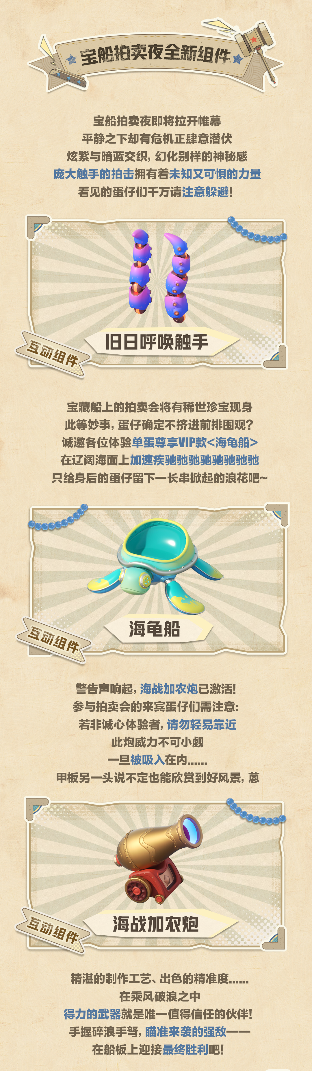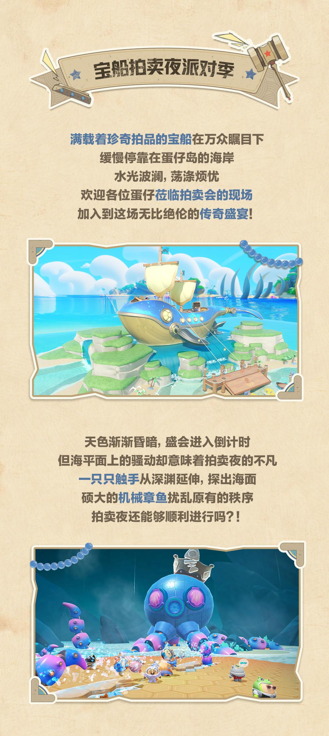 【S17宝船拍卖夜】7款组件+2大氛围实景率先解锁!光环-小Y发布于 2024-05-09关注“神秘拍品现世,诚邀蛋仔登船。”满载深海珍宝的宝藏船破浪而来船上各类珍品将面向所有蛋仔公开拍卖!在琳琅满目的拍品里最后一件神秘拍品让所有蛋为之瞩目……稀世珍宝,前所未见神秘的重磅拍品究竟为何物—— 5月17日(周五) 全新派对季【宝船拍卖夜】即将开启你,准备好登船了吗?