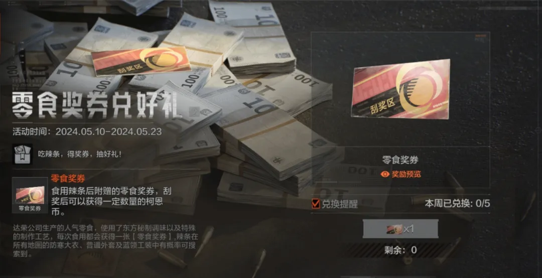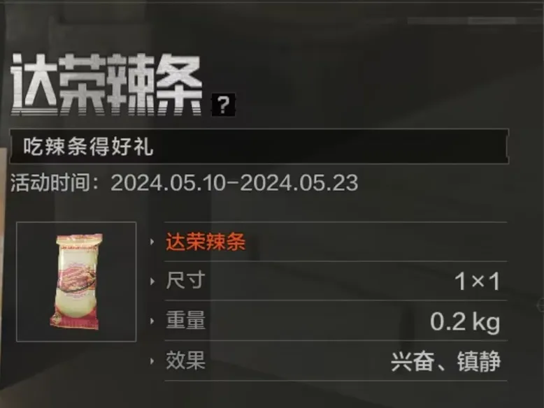 活动期间,所有地图的防寒大衣、普通外套及蓝领工装中有概率可搜索到达荣辣条,使用达荣辣条将随机获得兴奋或镇静效果并且必得一张【零食奖券】。