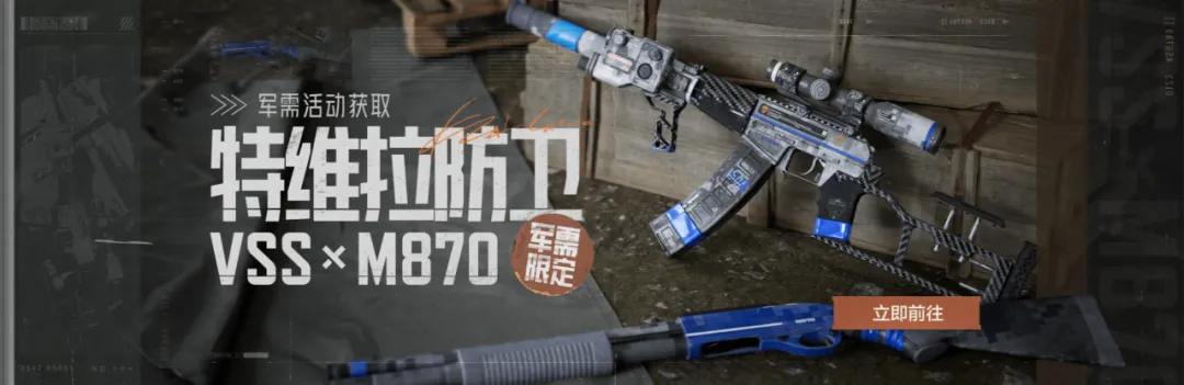 新主题军需特维拉防卫即将上线暗区,参与抽取有机会获得【特维拉防卫·VSS】和【特维拉防卫·M870】枪械涂装!