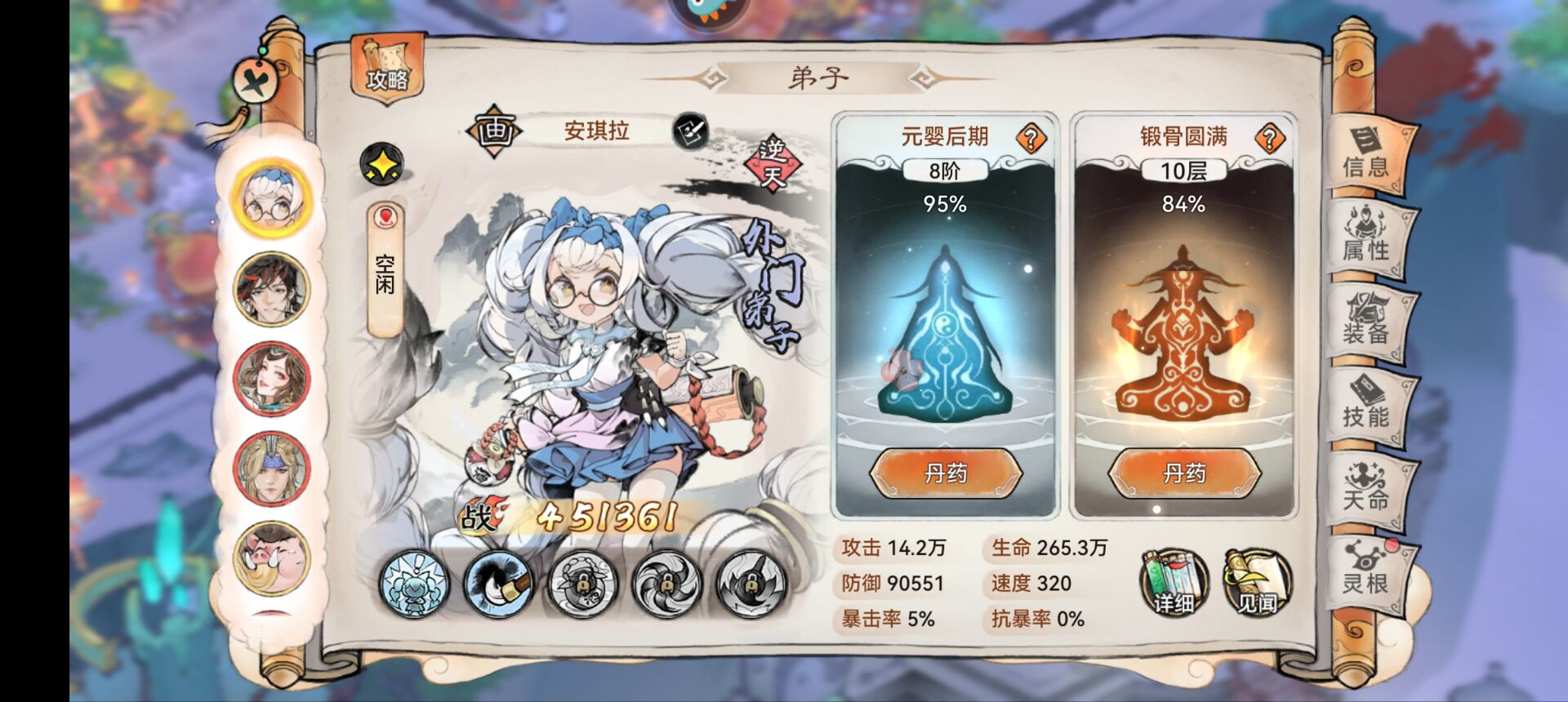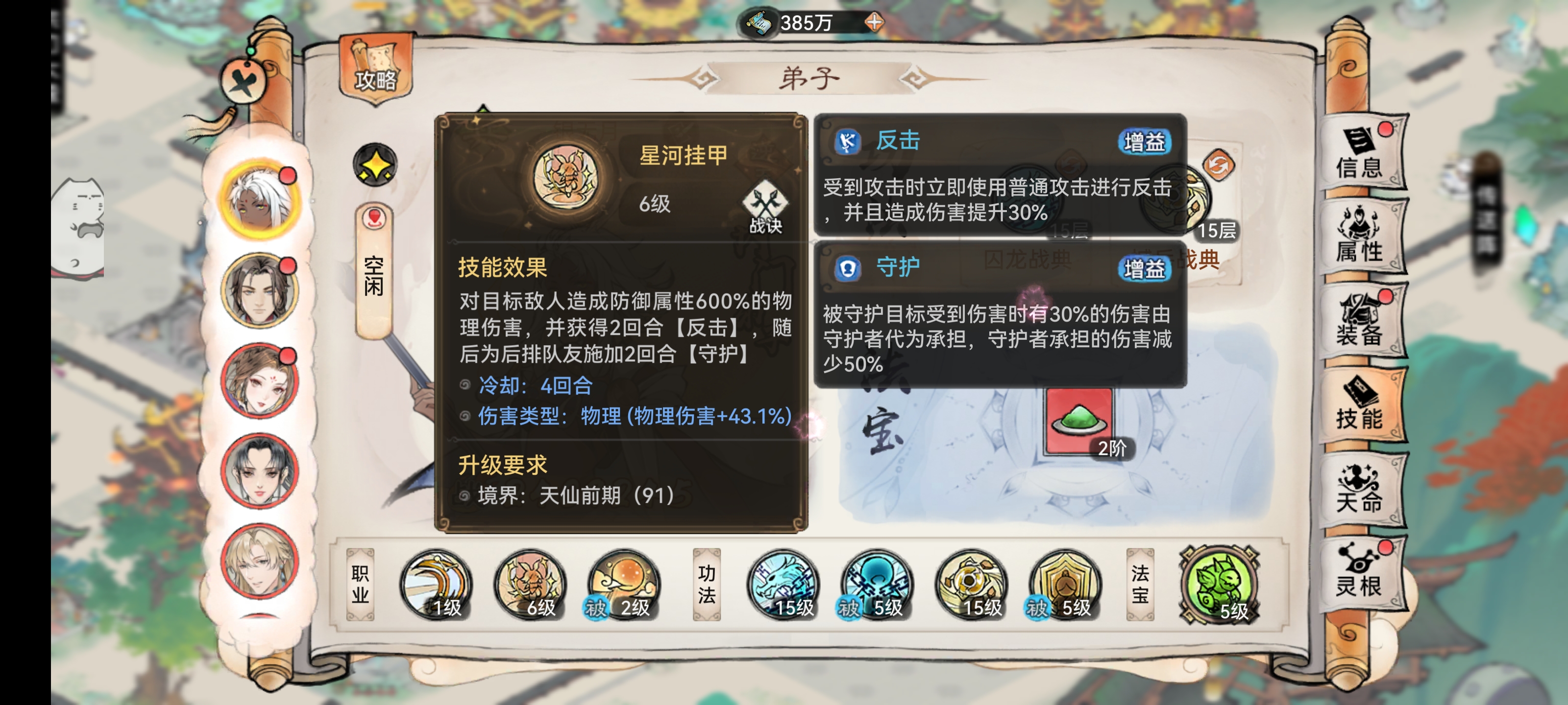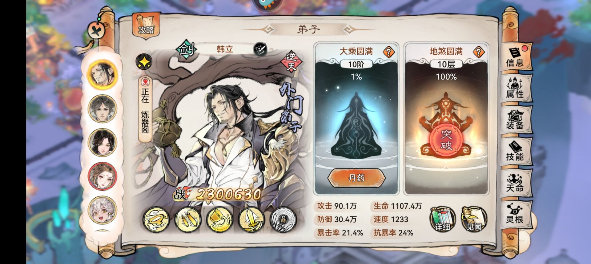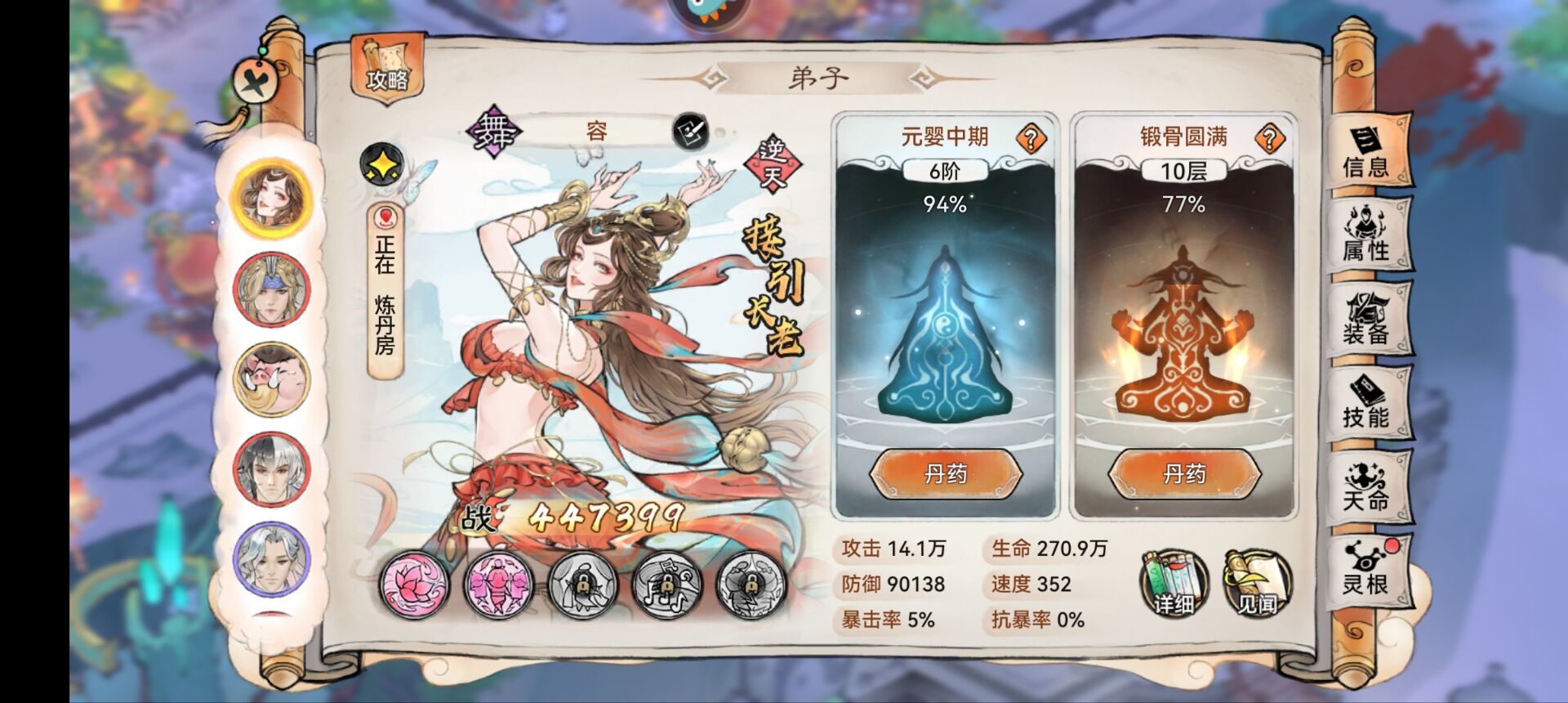 能够提升全体队友的攻击、暴击、和速度以及法宝蓄力。而且天命技能还有驱散增益的机制,自身还有一定的治疗能力。