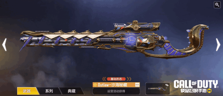 Outlaw-沙海秘藏的枪身由纯净的黄金材质打造,熠熠生辉,尽显奢华与尊贵。枪身中部的能量核心源源不断地散发出静谧的紫光,犹如沙漠中的一颗璀璨明珠,在阳光的照射下更显夺目。枪身点缀着彩色的图案似乎在讲述着古老王国的故事,每一个细节都充满了历史的痕迹。
