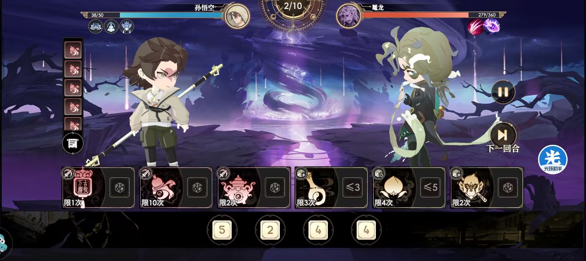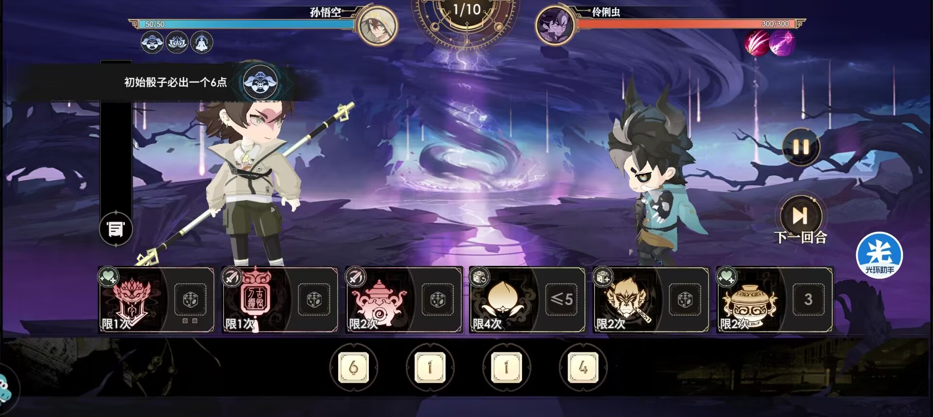 开局把4以上的数字喂给福星之果变6,然后1个把小数字喂给紧箍儿,激活脆弱状态。