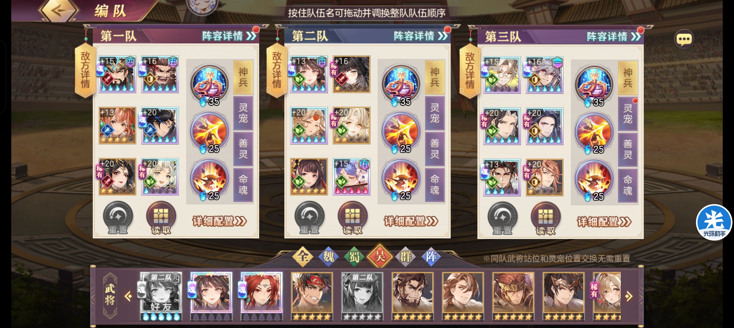 替换位问题:三队的马良可以替换一队的红香,然后将红香放到二队刷分,福寿可以用三红以上的王异替换,泽芸华佗可以替换位孙鲁育