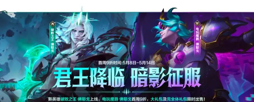 破败之王 佛耶戈已降临峡谷,其伴生皮肤电玩魔爵 佛耶戈也已上架商城。截止至5月14日23:59分,首周还可享受折扣优惠,更有大礼包及完全体礼包限时出售!