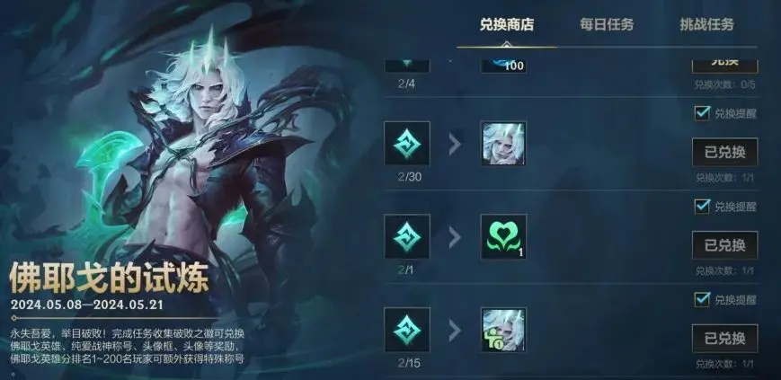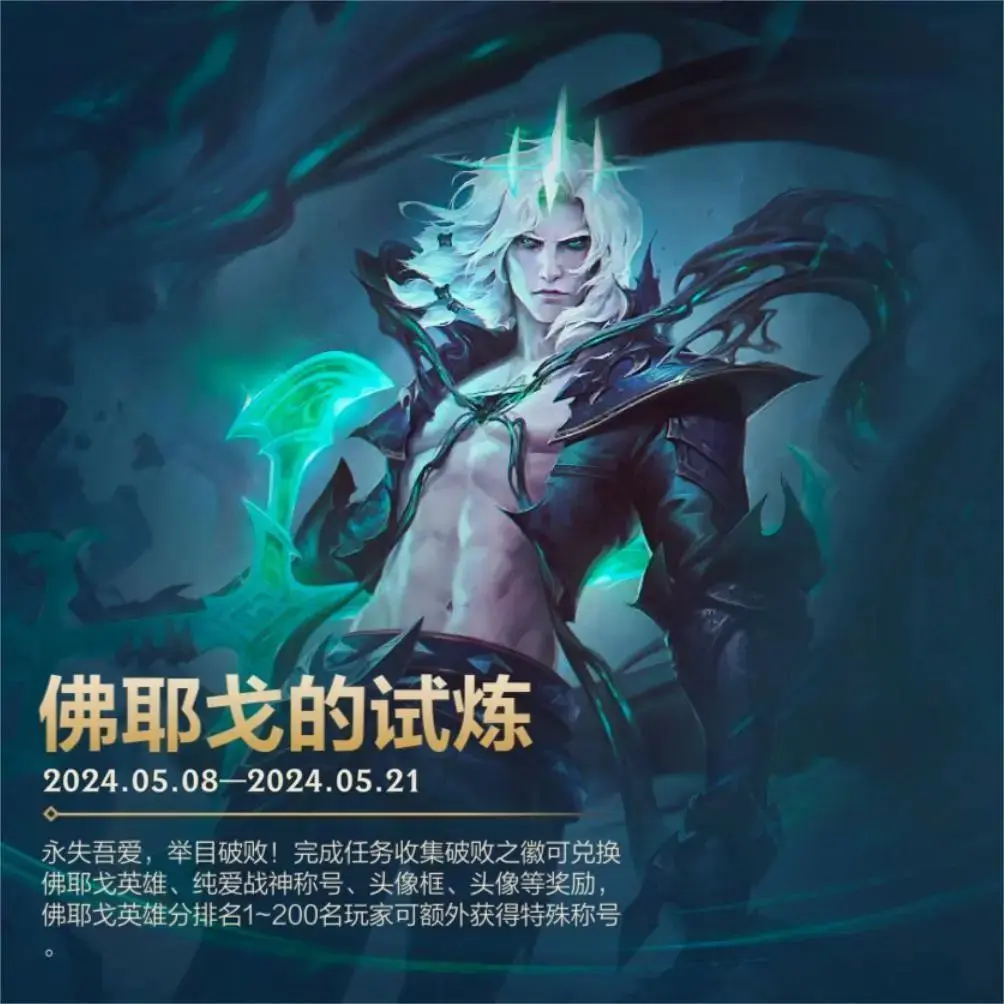 永失吾爱,举目破败!截止至5月21日23:59分,召唤师完成试炼任务,收集破败之徽,即可兑换佛耶戈英雄、“厄雾之息”头像框、“荒芜恨心”头像等奖励。