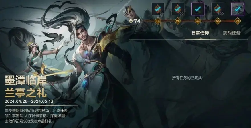 墨香四溢,兰亭有礼!截止至5月13日23:59分(明晚),召唤师完成任务,即可领取兰亭墨韵 大厅背景装扮、挥毫泼墨 击败印记和龙魂水晶*500好礼。