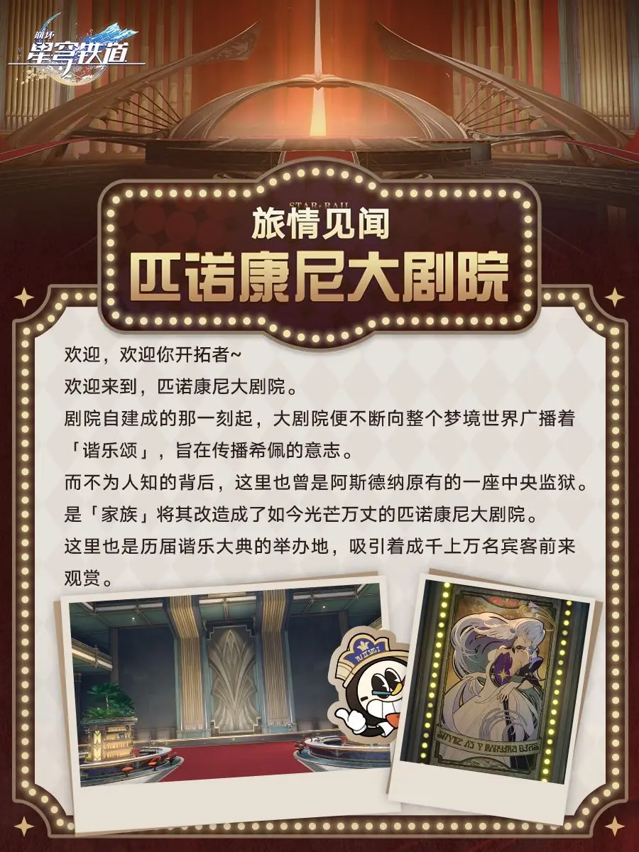 「旅情见闻 | 匹诺康尼大剧院」崩坏:星穹铁道 - 新闻星发布于 2024-05-13关注 欢迎,欢迎你开拓者。欢迎来到匹诺康尼大剧院。这里是历届谐乐大典的举办地,也是匹诺康尼的巨型地标建筑。或许提前了解一下对你的冒险会有帮助~