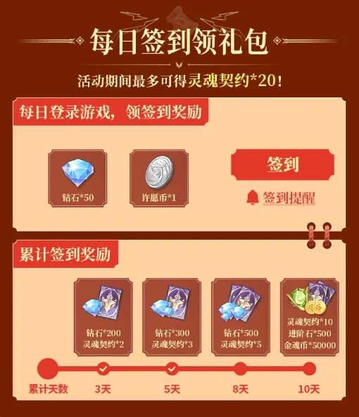 开启「每日签到提醒」,灵魂契约*20、许愿币*12、钻石*1600等好礼全部收入维序者背包!