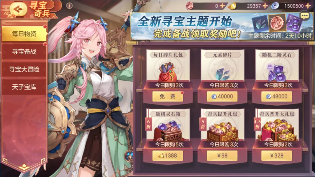 活动期间,每日物资大放送~每天可消耗银两购买元素碎片、随机二阶灵石。消耗元宝购买辽东藏宝图碎片、随机灵石箱,内含随机三阶灵石及寻宝奖章。充值购买奇兵礼包,内含元宝,寻宝奖章等资源。