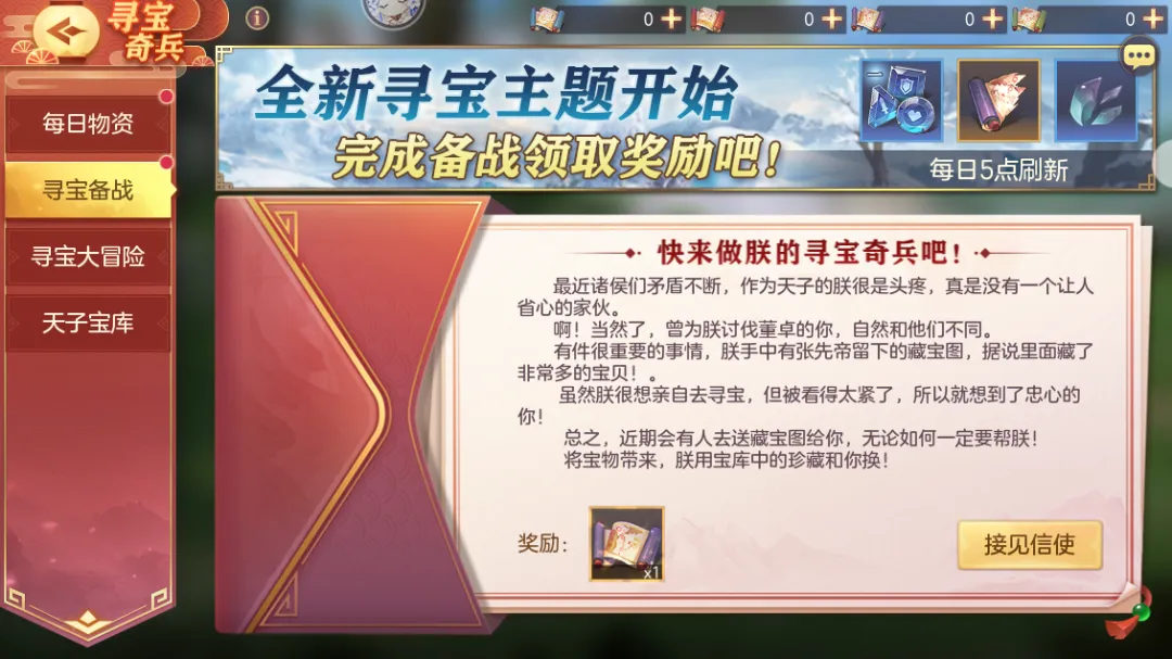 活动期间登录即可接见信使一次,接见信使后可获得辽东藏宝图*1,可用于寻宝大冒险!接见信使后,开启寻宝备战任务。每日完成组队讨伐、家园互动、群雄逐鹿等玩法条件即可获得辽东藏宝图碎片及元素碎片、随机一阶灵石等奖励。