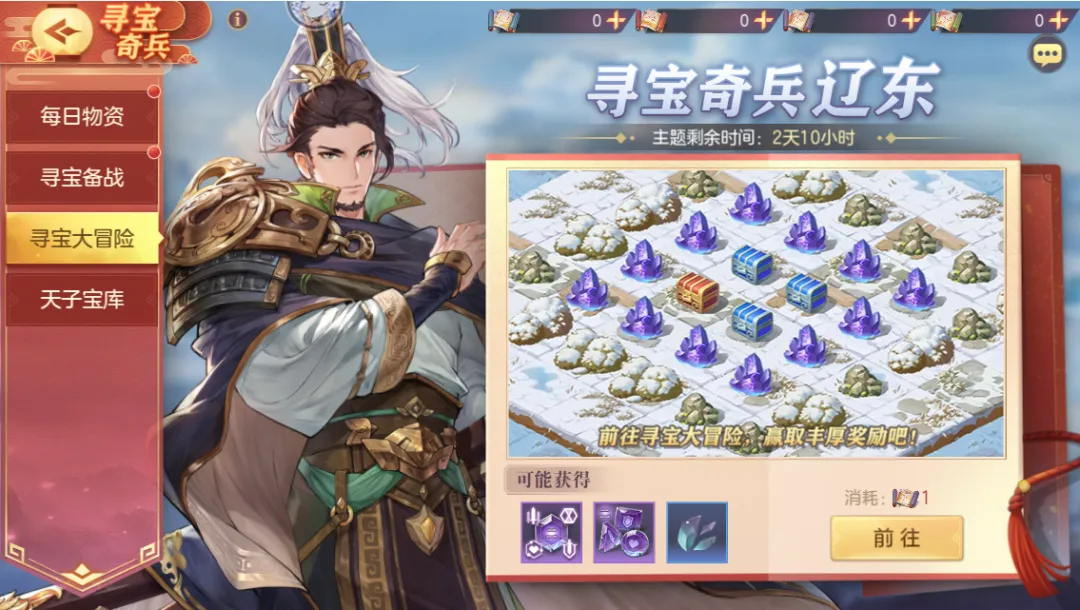 集齐9个辽东藏宝图碎片即可合成1张辽东藏宝图,使用后可开启一次【辽东】主题的寻宝大冒险玩法。