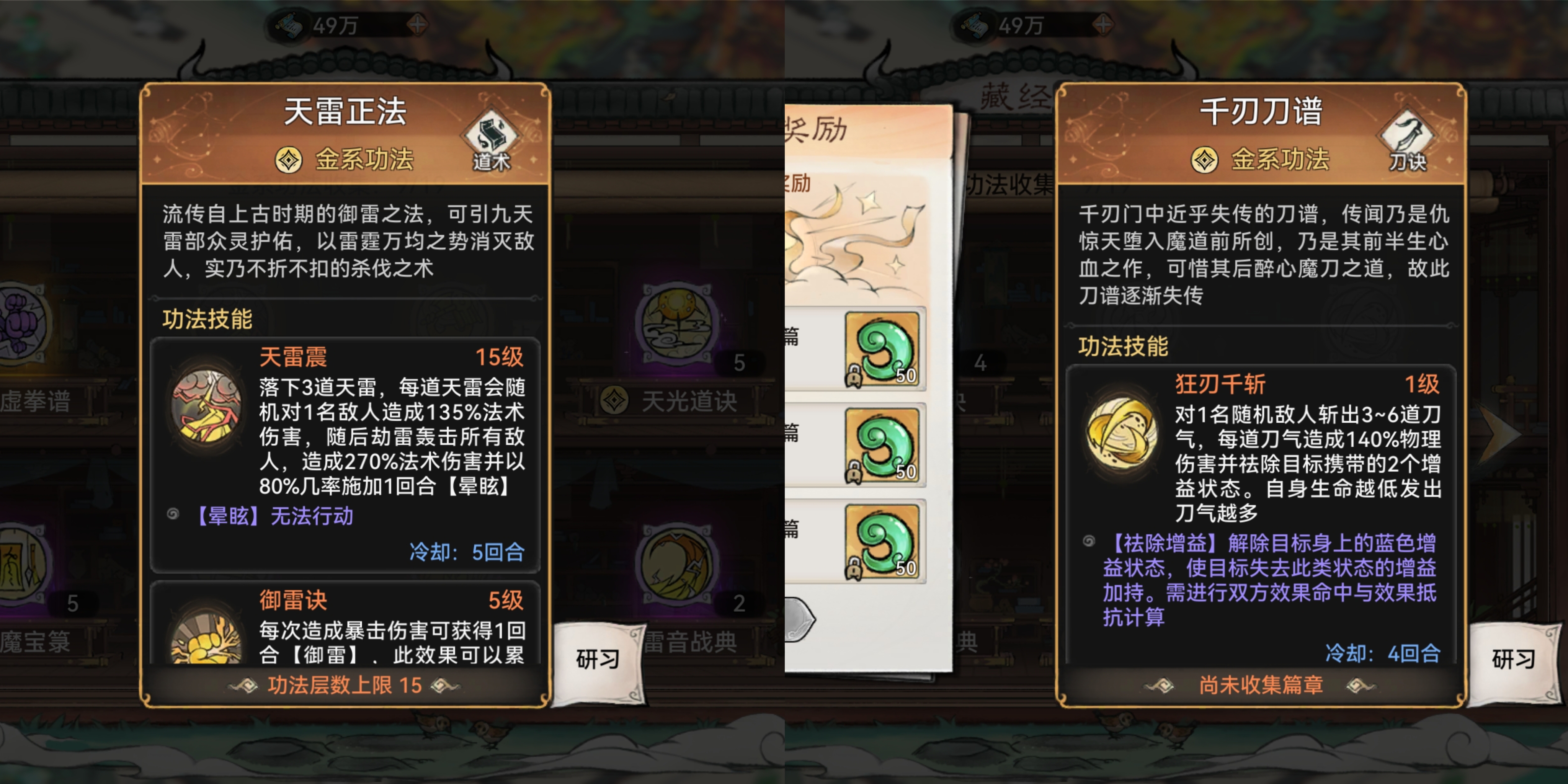 此外功法还有另外的搭配思路:金系【千刃刀谱】+【天雷正法】。如果没有傲雪刀决和囚笼战典的玩家,可以用金系的这两本功法来替代。