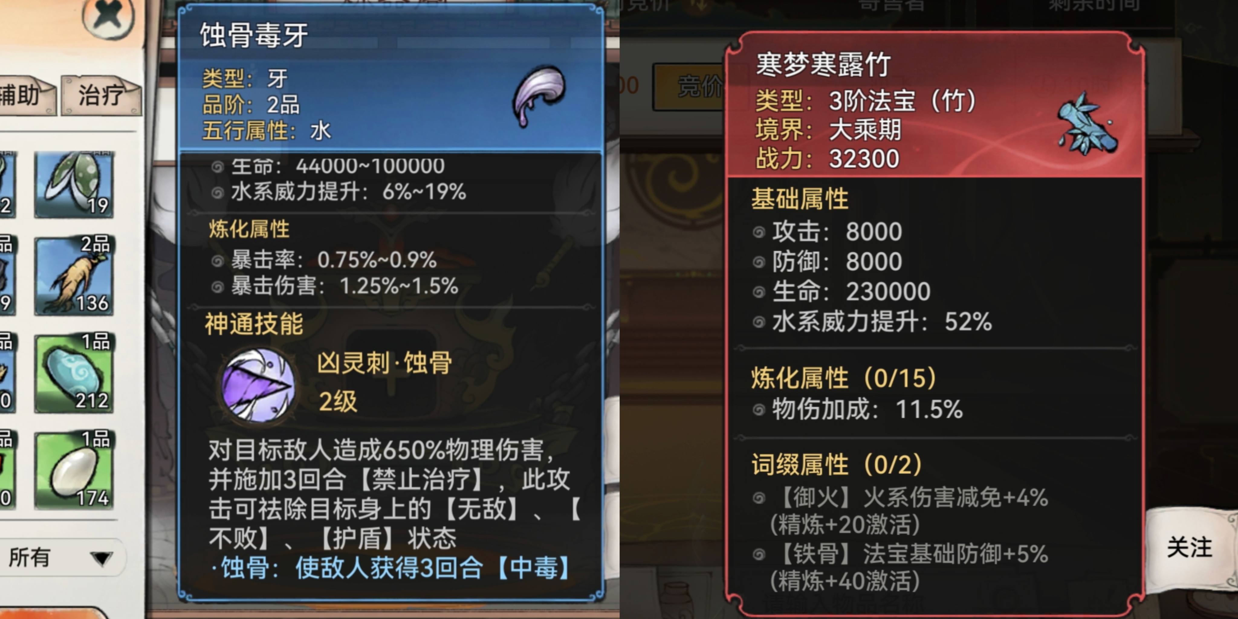 ③法宝推荐:水系【2阶毒牙】和【3阶竹子】。2阶毒牙练化属性提供的是双爆。而且法宝技能可以祛除目标的无敌、不灭、护盾。三种状态,非常适合刀修。