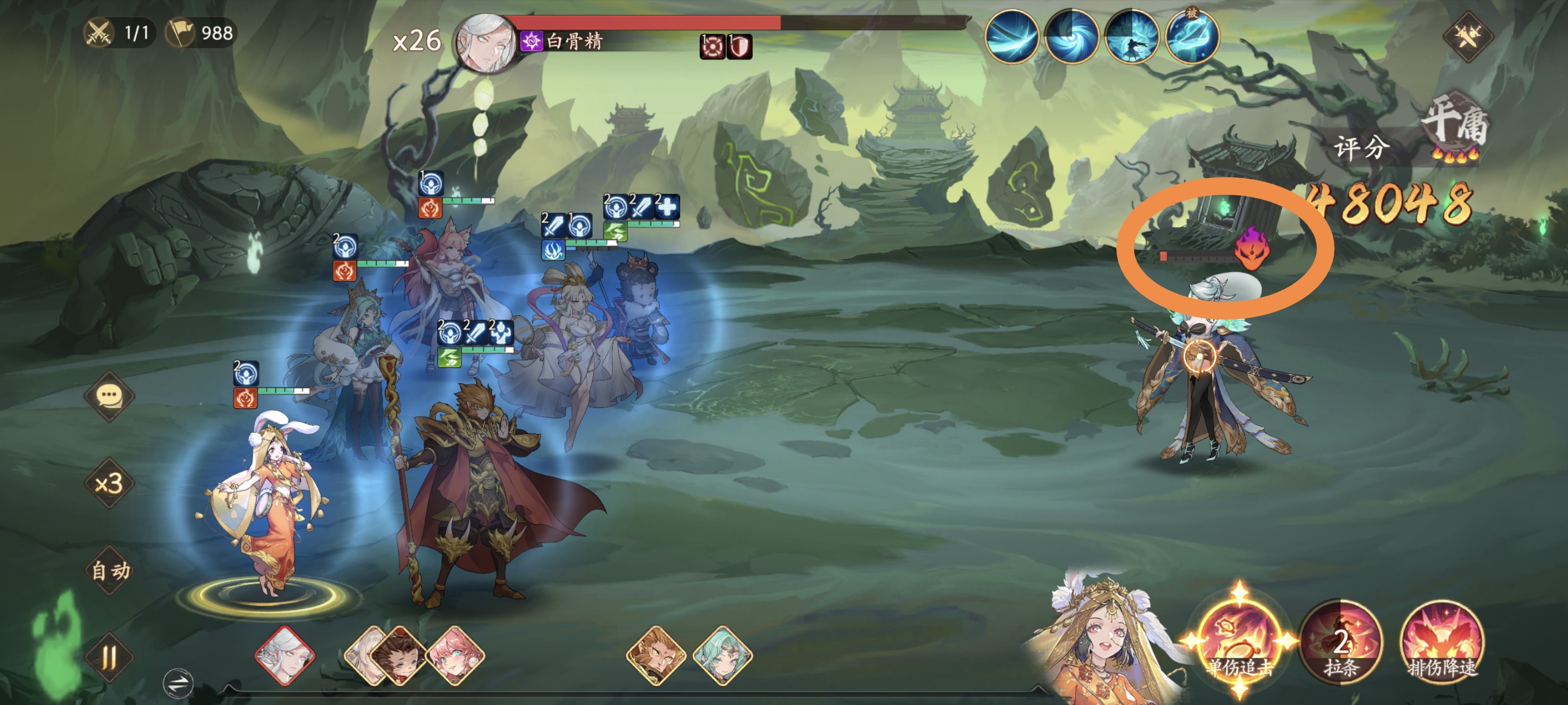 狐狸除了拉条之外,2技能标记同有增伤功能,与孙悟空一样,保证技能不要打在小怪身上。孔雀是奶妈没什么好说的,一直放治疗保持血量就行。