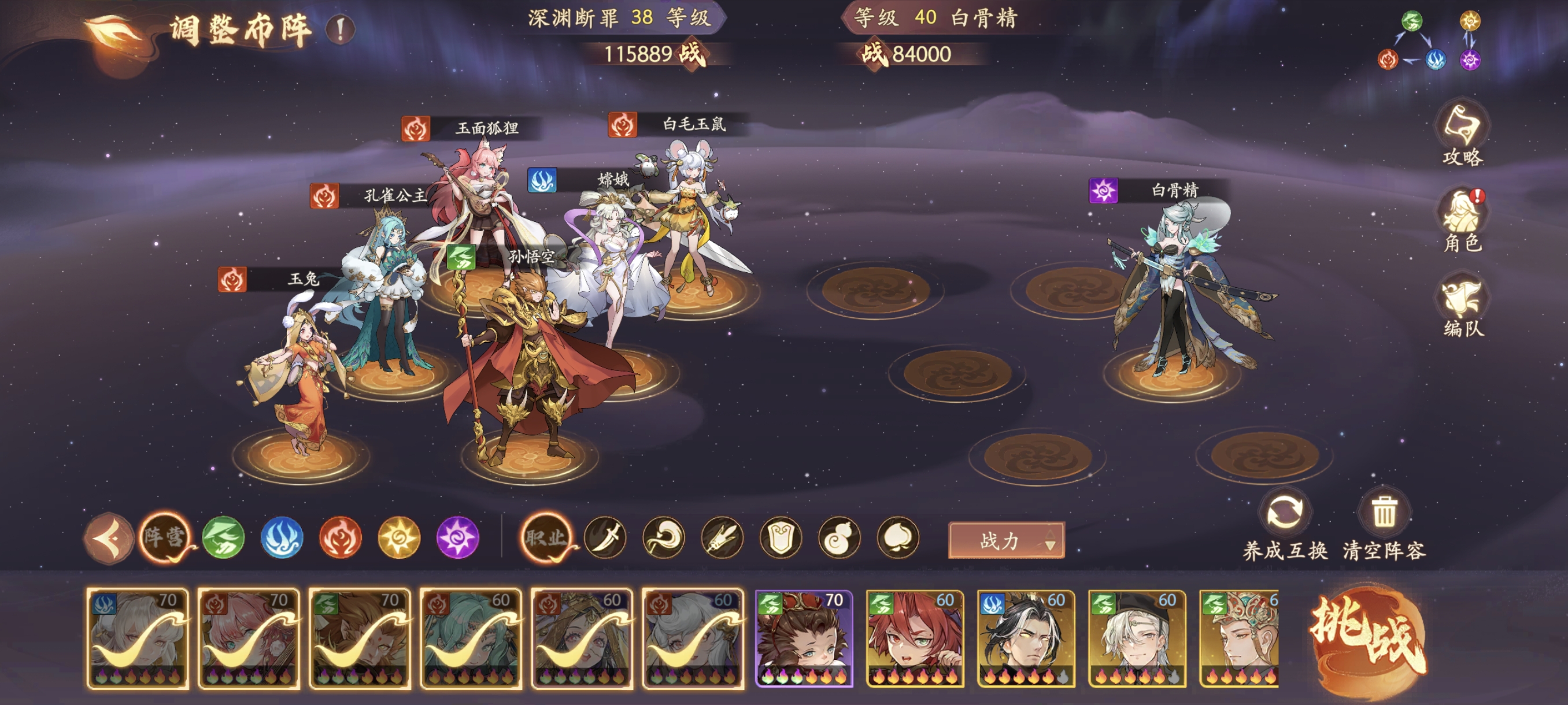 玉鼠嫦娥孙悟空站一排,保证嫦娥的加攻能覆盖到所有C位,孙悟空为减防手,保证3技能减防每次都打在BOSS身上,不要交给小怪。
