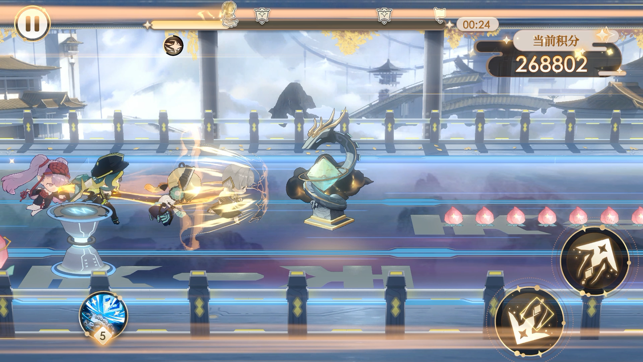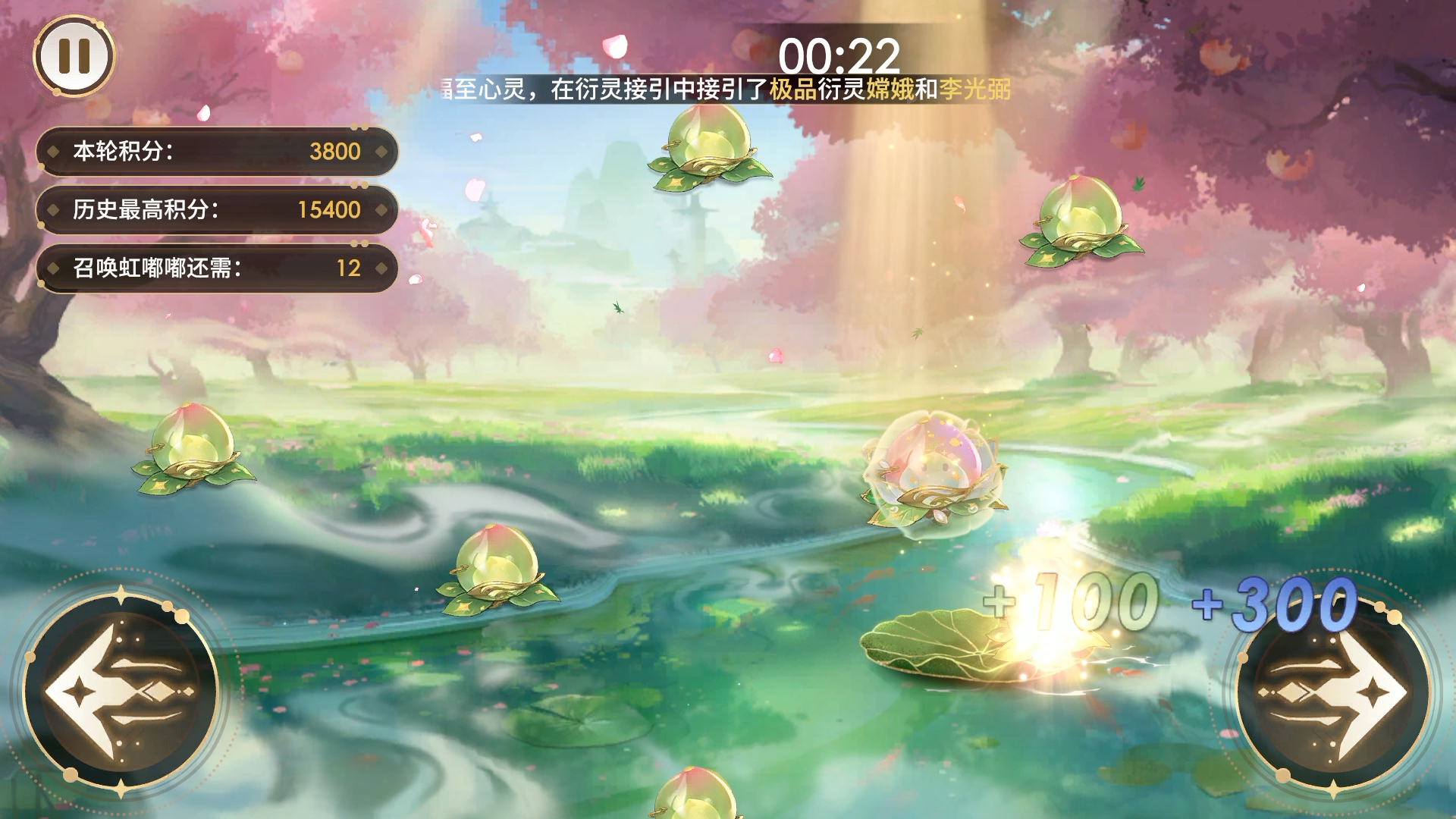 全新小游戏桃之夭夭随蟠桃会活动一同开启!游戏中需要玩家操作荷叶接住下落的桃子以获取积分,不同种类的桃子积分不同,其中粉扑扑100分,金闪闪300分,虹嘟嘟1000分!