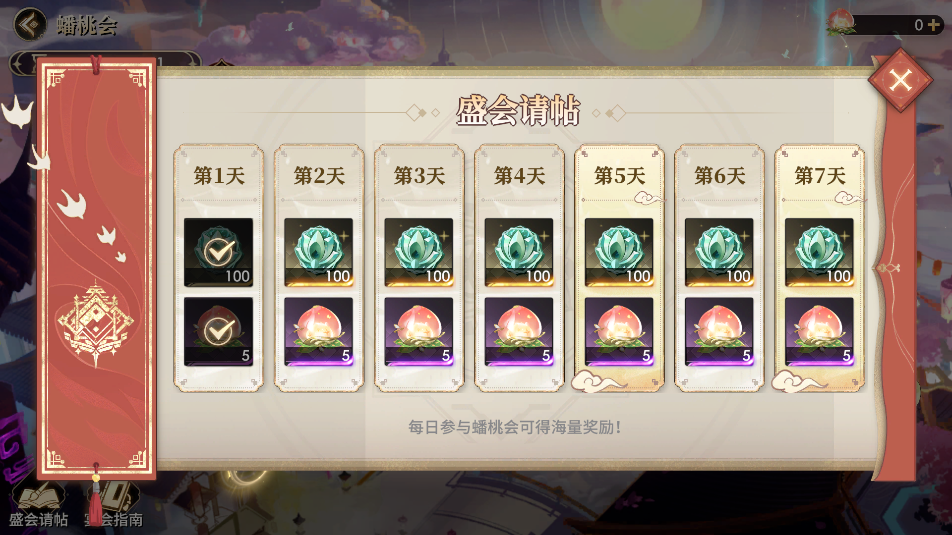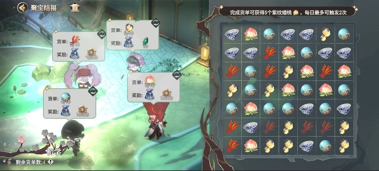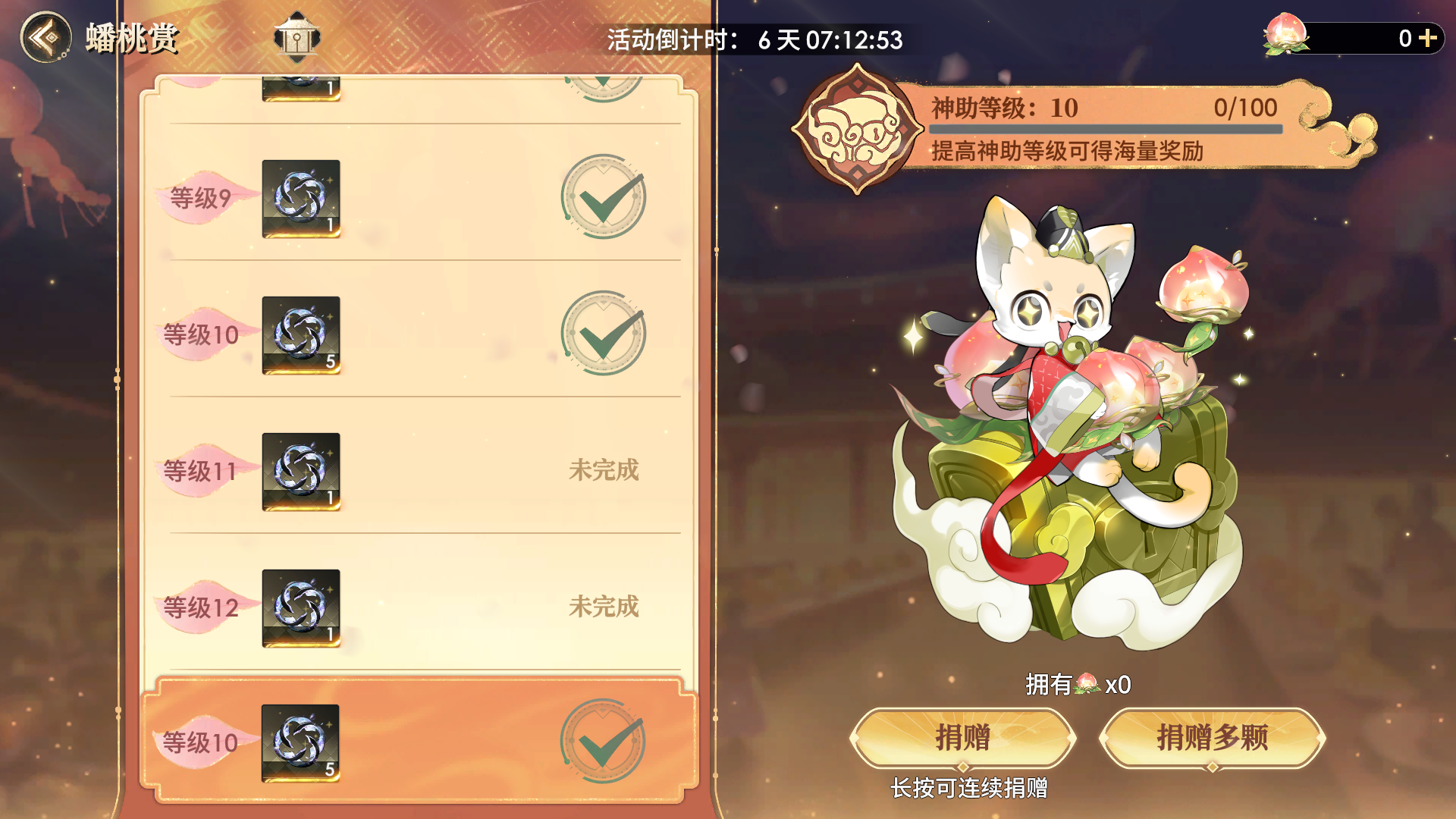 另外,每获得3000积分,还可获取一颗紫纹蟠桃,可用于蟠桃赏玩法中进行捐赠!每日最多可通过桃之夭夭玩法获取10颗紫纹蟠桃。